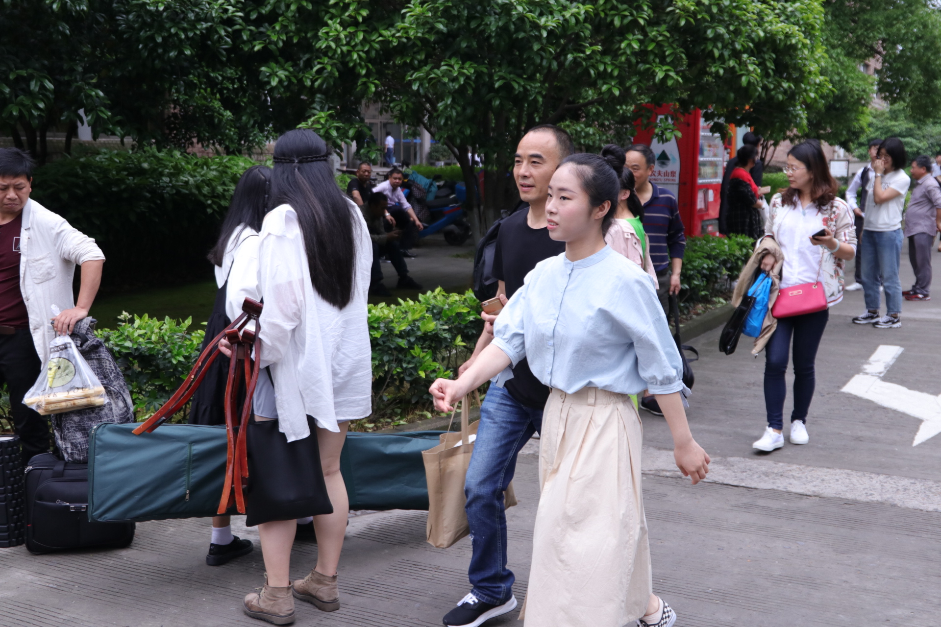 早晨七点,考生们就进入浙艺校园,或在艺池边,或在中心广场,或在图书馆旁,拿着台词,下着腰,喊两嗓开开嗓准备考试。五号楼前,红红火火的横幅正在鼓励考生:自信备考,为理想插上艺术的翅膀。