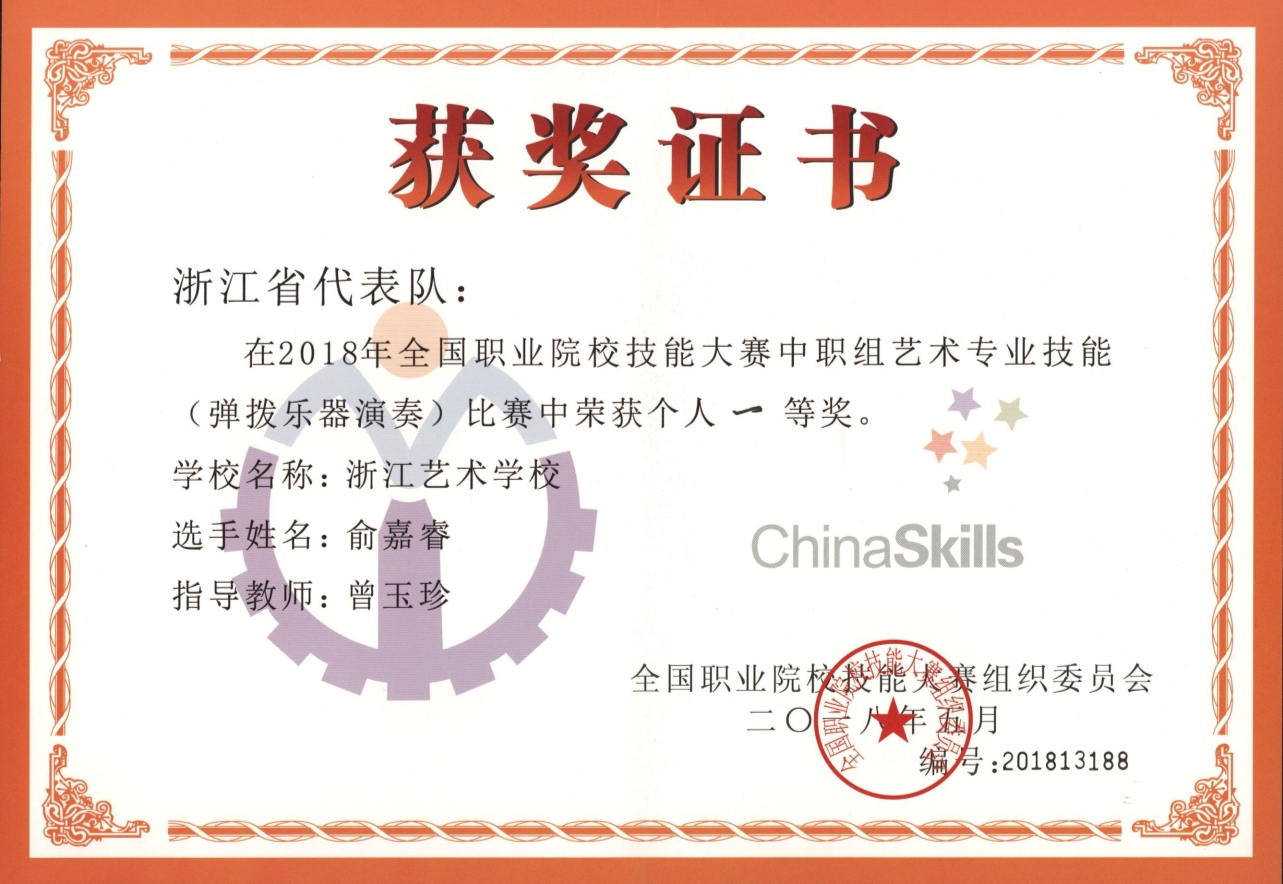 我国辞书之祖、儒家经典之一《尔雅》中写到:“春为苍天,夏为昊天。”春是一天中的清晨,也是人生中的青春。有一位风华正茂的小伙,在浙艺音乐厅舞台上,以一曲满怀春天感悟、生命礼赞的筝曲《苍歌引》,夺得2018年全国职业院校技能大赛艺术专业技能(弹拨乐器演奏)赛项中职组一等奖,他就是浙艺附中俞嘉睿同学。他的指导教师,是浙江省音协古筝教育专业委员会副会长、浙江艺术职业学院音乐系副教授曾玉珍。