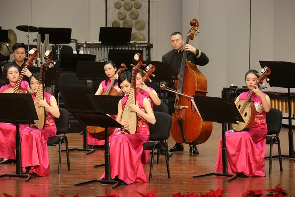 江南丝竹《中花六板》《吹歌》根据江南传统名曲《老六板》《骑驴吹仔》改编而来,由音乐系副主任高澄明、民乐教研室主任王慧芳等教师共同演奏,为音乐会带来了缕缕清新柔美的风。