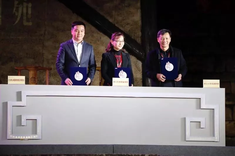浙江艺术职业学院院长黄杭娟与浙江小百花越剧团党总支书记刘建宽、湘湖国家旅游度假区管委会副主任韩钟签约,为浙江做客文化创意有限公司罗可歌导演工作室授牌。