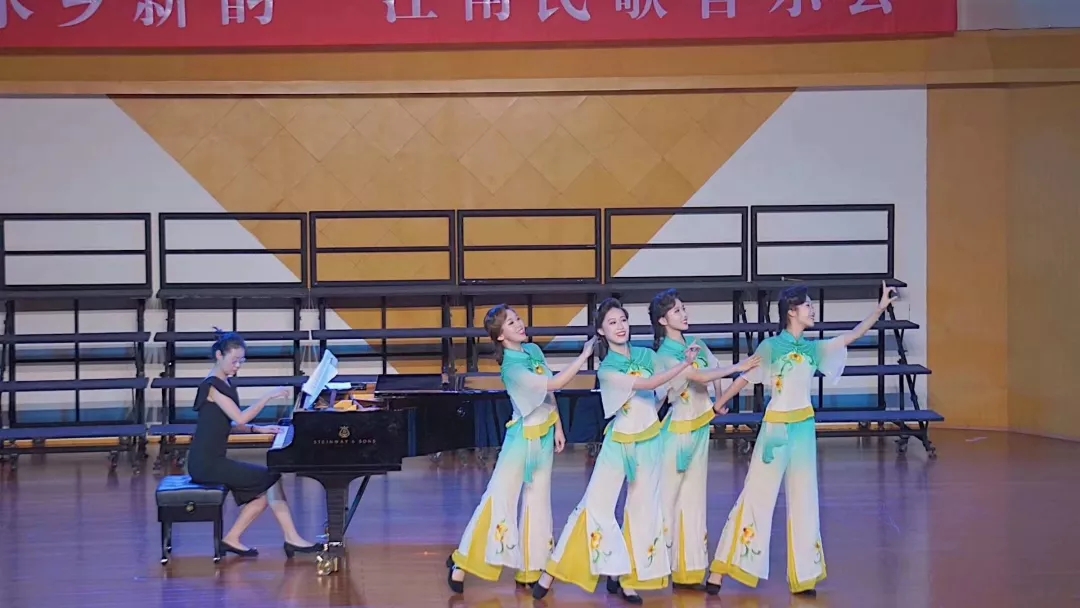 “溪水清清溪水长,溪水两岸好风光……”音乐会在《忆江南·新采茶》的旋律中开启。这首改编自家喻户晓的江浙民歌《采茶舞曲》的新版女声小组唱作品,由10名女生演绎。在我国民族民间音乐大家庭中,江浙一带的民歌以其清新委婉、活泼灵动的特质占有重要位置。音乐会上,江苏民歌《紫竹调》《四季相思》《拔根芦柴花》是耳熟能详的江南曲调,用女声重唱、独唱的形式展现出原样风貌。女声联唱《茉莉花》合着富有爵士乐韵味的钢琴伴奏,使这首地道的江南民歌有了现代新民歌的意味。用温州方言演唱的《对鸟》由刚刚获得2019全国职业院校技能大赛声乐赛项二等奖的张銮楠同学带来,这首在温州几乎人人会唱的地方民歌收获了现场观众的热情欢迎。创作于上世纪九十年代的《茶山情歌》最初由歌手杨钰莹用通俗唱法演绎,在这次音乐会上,4位女生用载歌载舞的表演唱形式再度将这首江西民歌搬上了舞台,别有一番风味。用沪语演唱的上海民歌《啥鸟飞来节节高》,透过婉转的曲调,吴侬软语的江南韵味油然而生。
