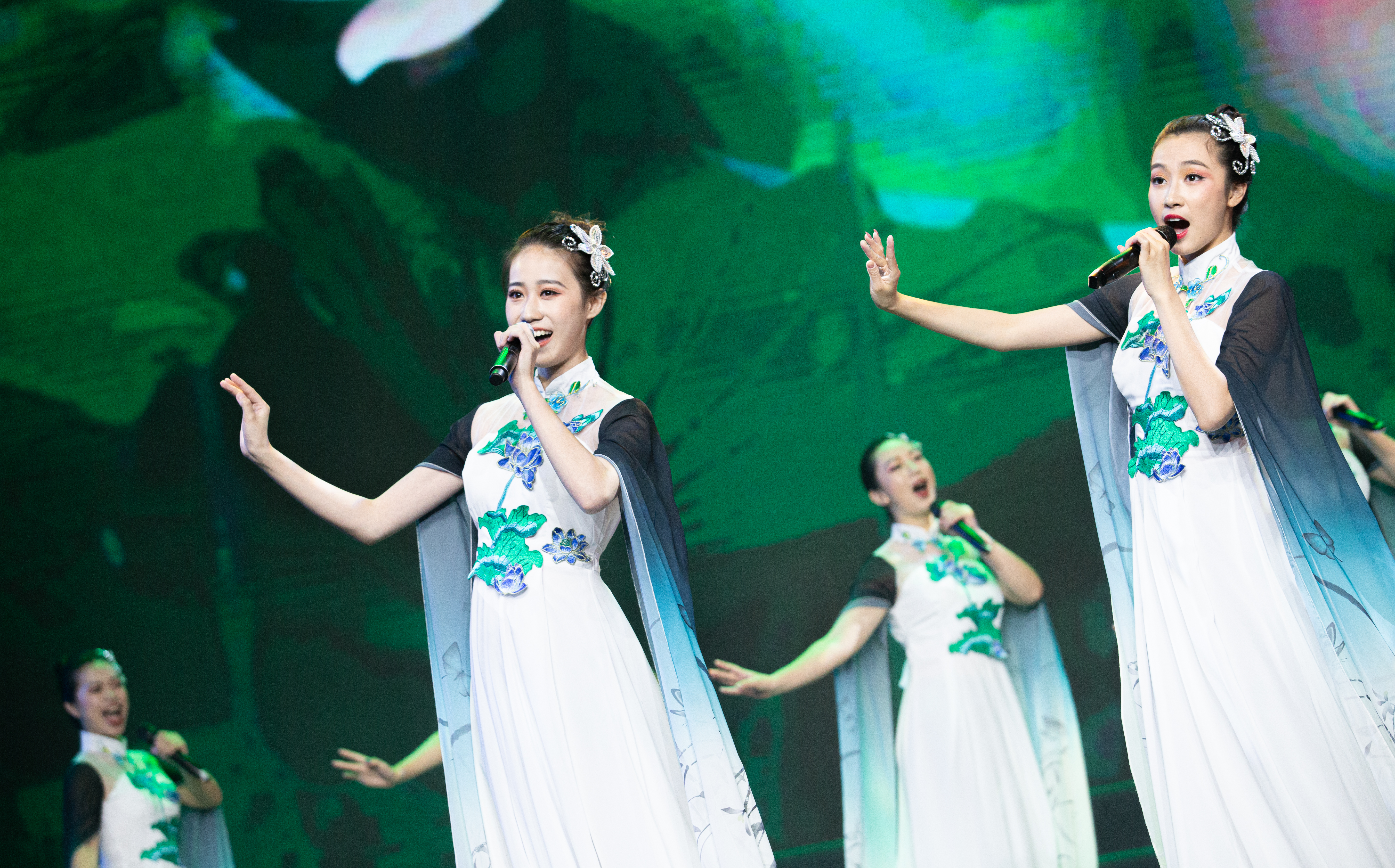 朱卓凡、沈贝贝男女声二重唱《不忘初心》,“向往你的向往,幸福你的幸福”,深情表达了对祖国的爱和祝福。韩紫娟、李猛等歌曲联唱《我爱你中国》《天耀中华》、丁倩文等女声四重唱《问春》,悠扬的歌声献上了对祖国在前进道路上再创辉煌的美好祝愿。音乐系陈利宏等师生联合演奏的打击乐《新龙腾虎跃》,鼓声震撼,让观众血液沸腾。我校经典剧目、舞蹈系获得全国“桃李杯”舞蹈大赛一等奖的群舞《畲家女儿拍》节奏欢快,展现了别样的民族风情。歌唱家、浙艺实践部副主任陈芬芳演唱了《中国进入新时代》,用歌声弘扬社会主义主旋律,展现了中国在未来道路的美好前景。