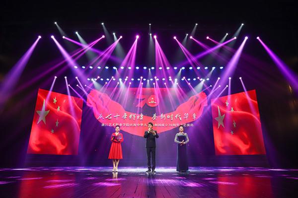 9月27日晚,浙江艺术职业学院庆祝中华人民共和国成立70周年文艺演出在实验剧场隆重举行。浙江中医药大学、浙江警察学院、浙江商业职业技术学院等兄弟院校领导、滨江浦沿街道相关领导,学校党委班子成员、全体处级干部,滨江六校师生代表等欢聚一堂、观看演出,共贺新中国70周年华诞。