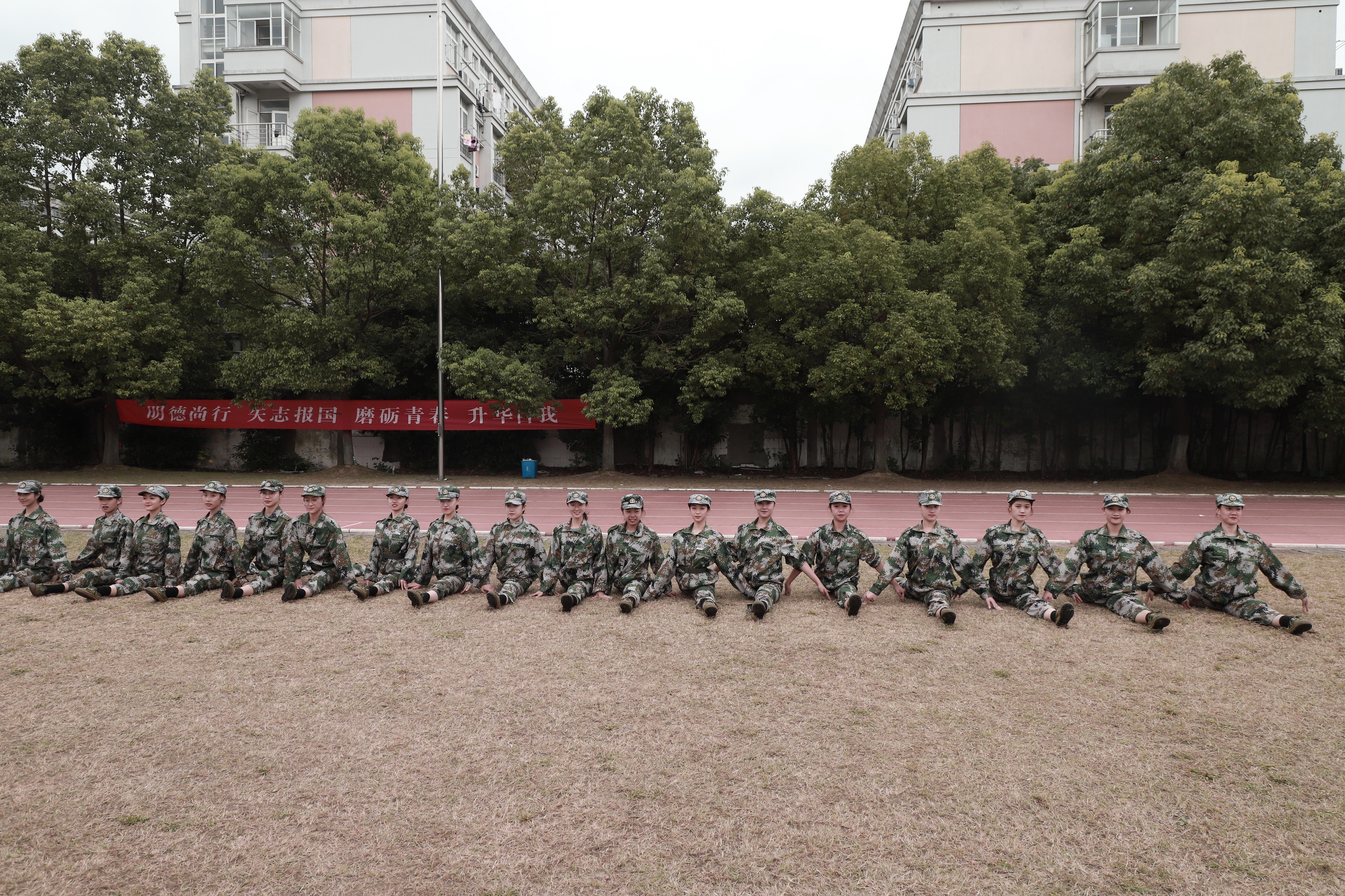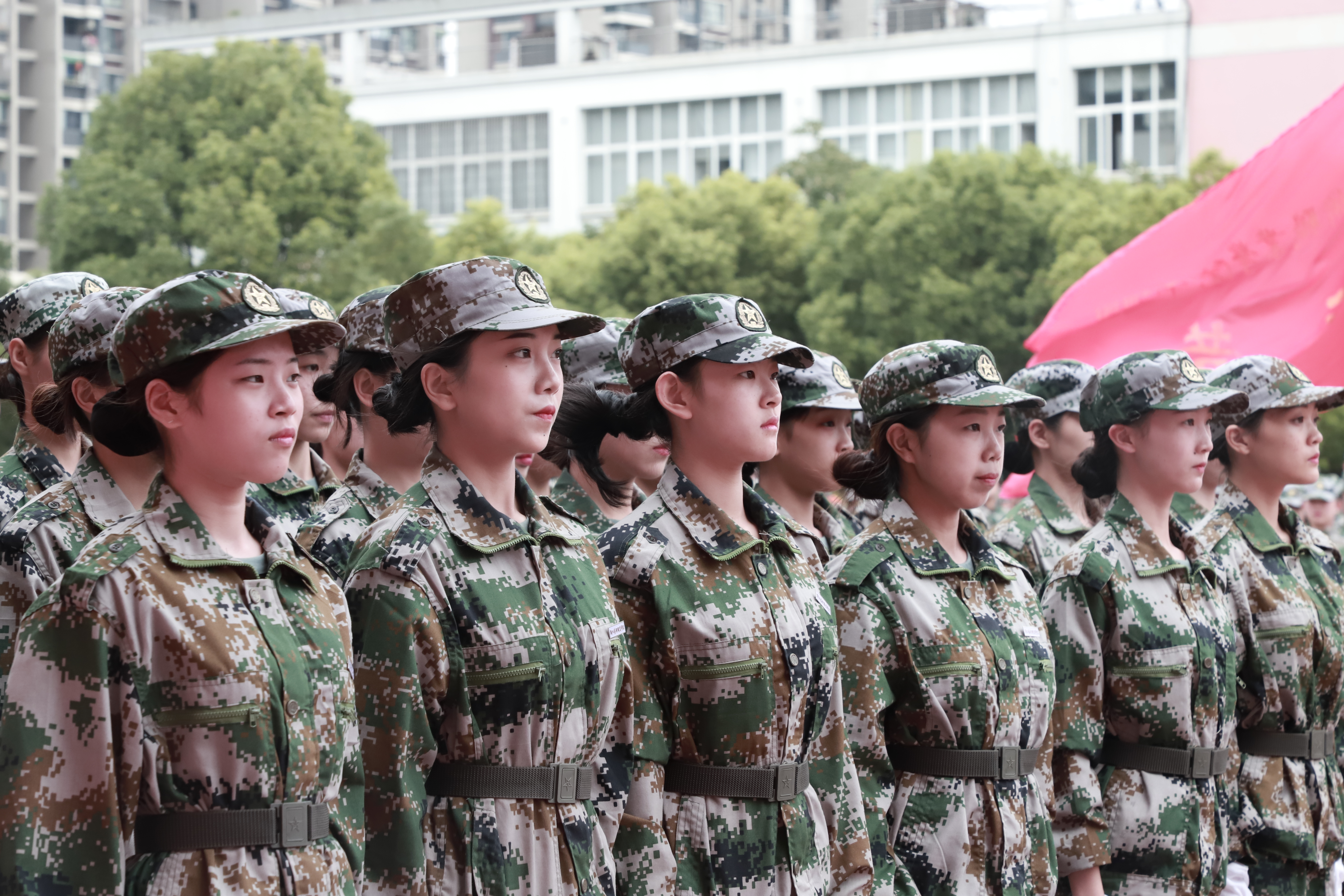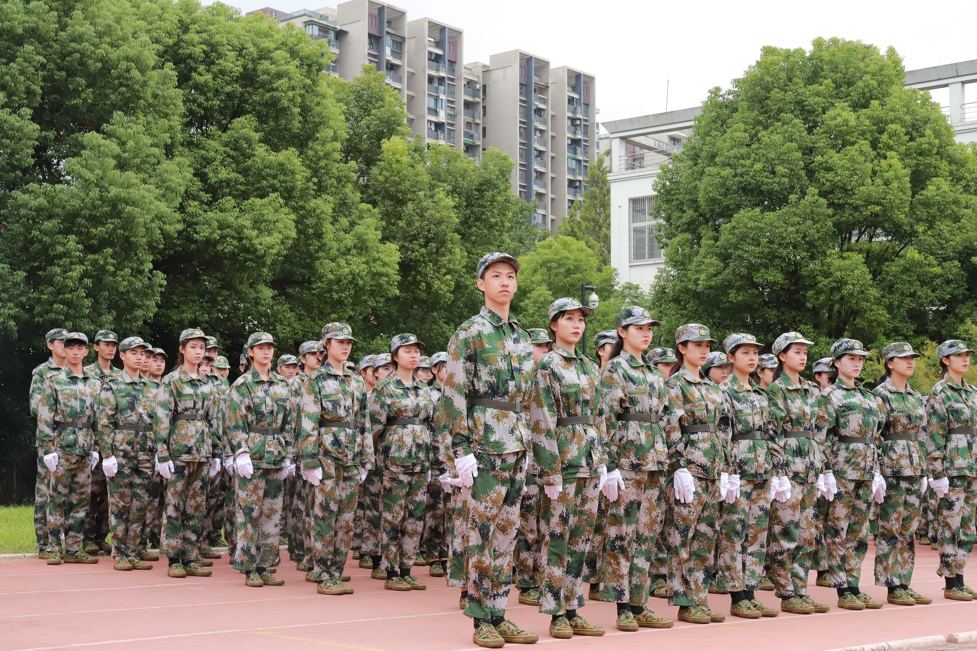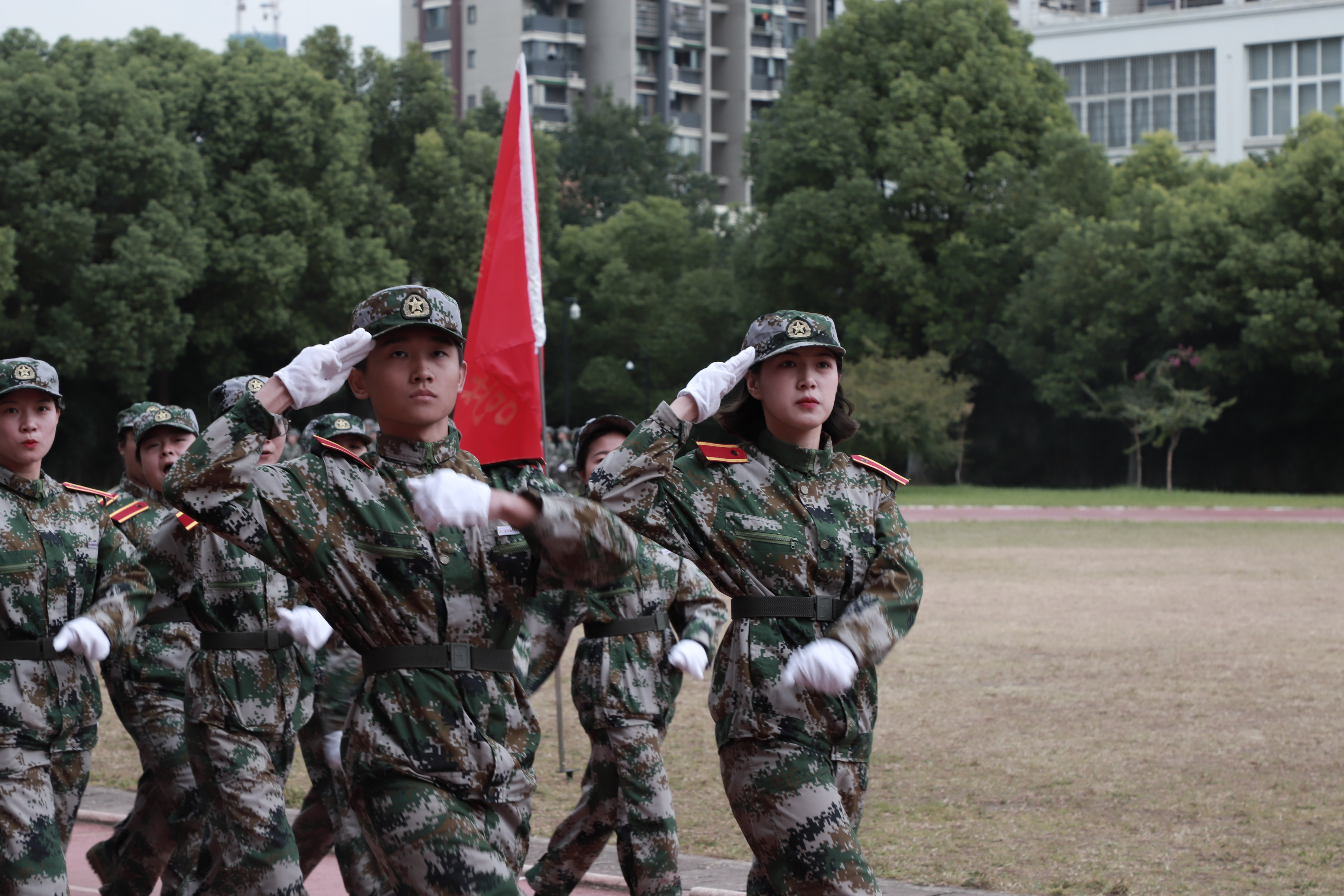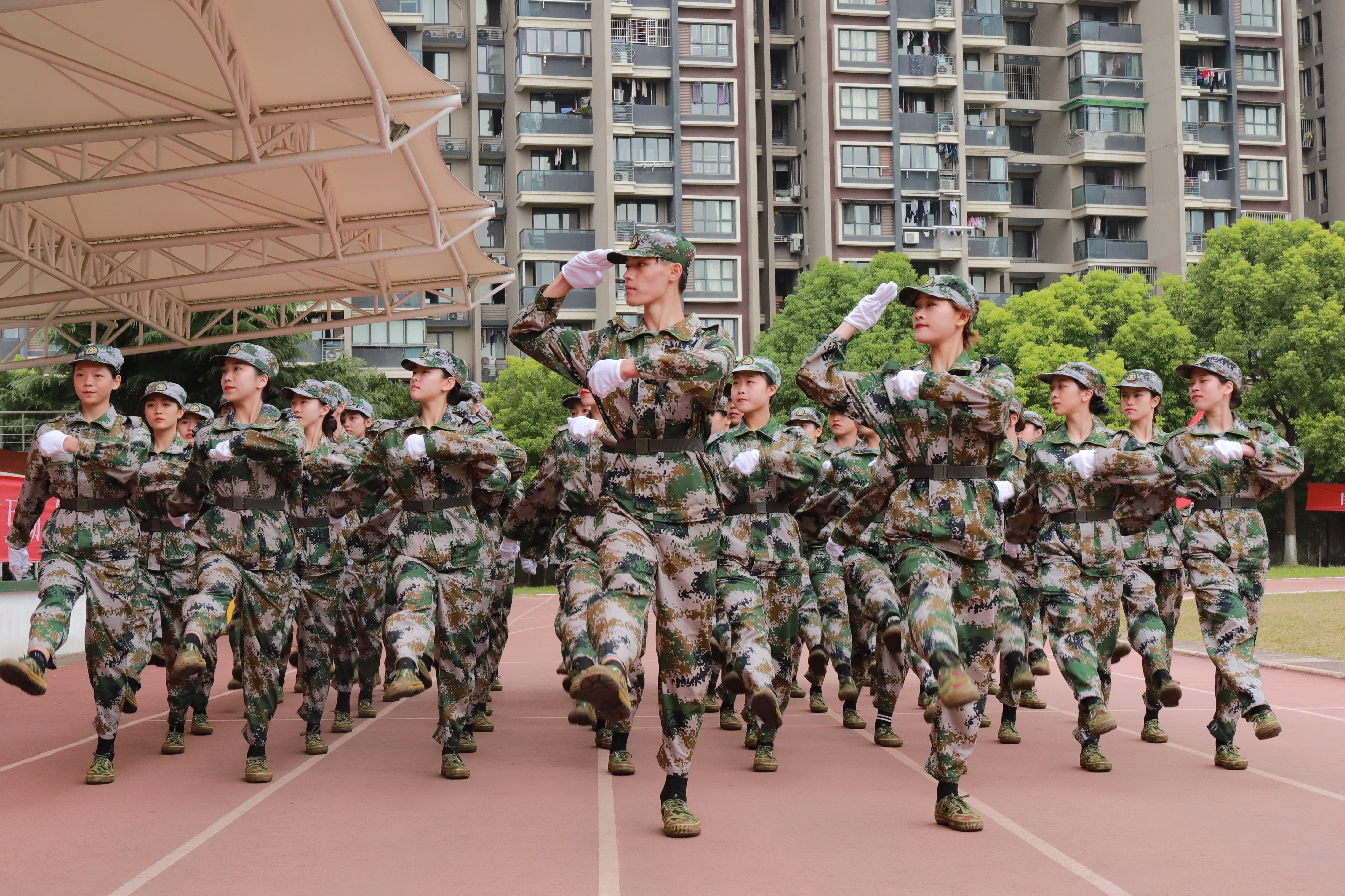 各营连新生进行会操表演,经过13天刻苦训练,他们步伐整齐,精神抖擞,目光炯炯有神,展现了浙艺学子的青春风采和精神风貌。