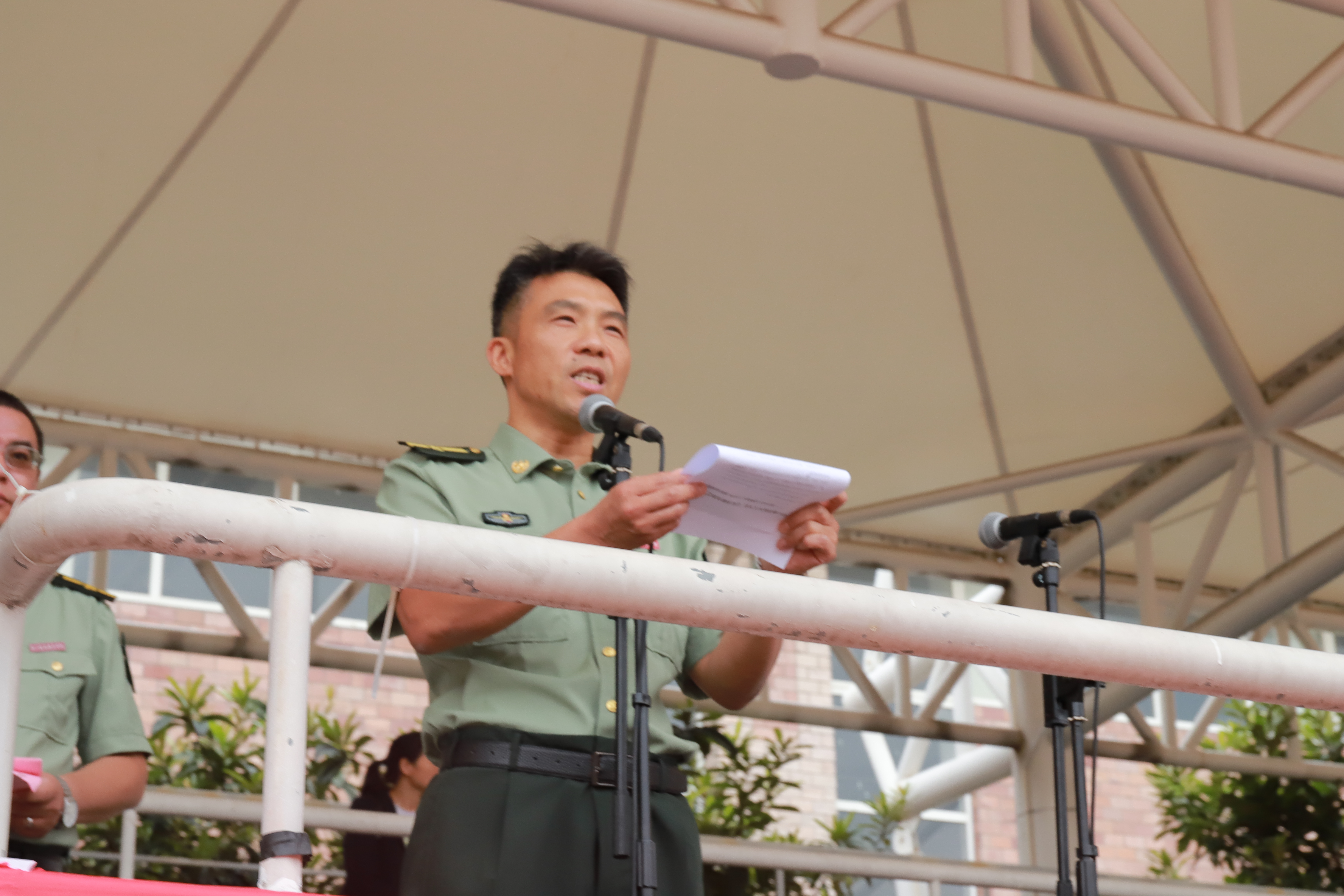 夏开堂宣读军训先进个人和先进集体名单,对新生进行了检阅。