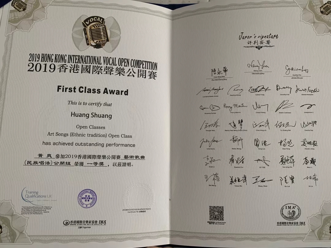 2019香港国际声乐公开赛杭州赛区比赛艺术歌曲专题青年A组一等奖第一名;