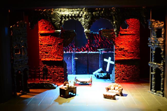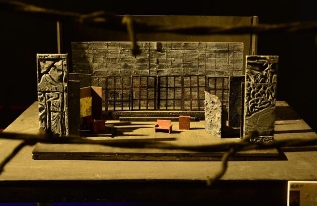展厅一角,还有一个与《巴尔干妇女》实景不同的模型,充满了艺术性的大胆尝试,用了镜面的亚克力板,舞台压得很低,给人一种压迫感,细缝中的红光象征着战争的血腥,镜面上用了锡箔纸做出破碎山河的样子,其制作充满想象力,也从细节处展示出战争对人们的伤害。模型制作者许益畅说:“舞美设计是一个不断推翻的过程,但就是在这样的过程中才能学习,不断进步!”
