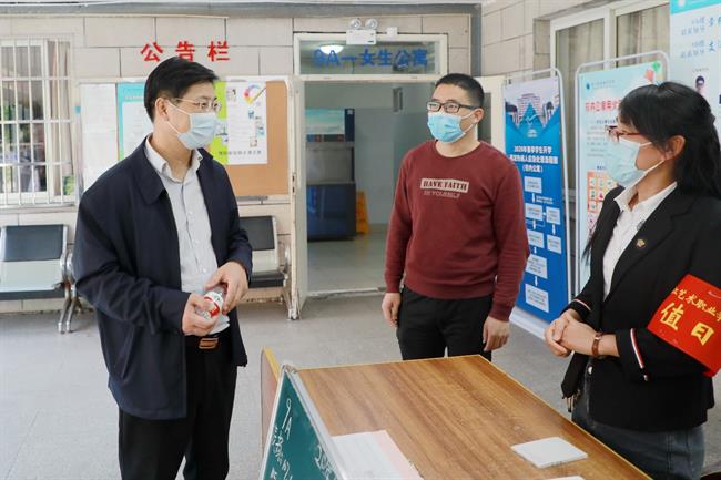 干武东一行实地查看了校园南门、西门进出口、戏剧系、舞蹈系专业教室、公共基础课教室、临时观察点、食堂、学生公寓等,听取了学校附属中专复课情况和高职开学准备工作汇报,对学校有关师生健康排查、学生返校入校程序、应急情况处置流程、公共区域通风消杀、就餐安排、校园安全管控、学生心理健康等工作予以肯定,表示学校工作做得细致到位,对相关环节提出了具体指导意见。