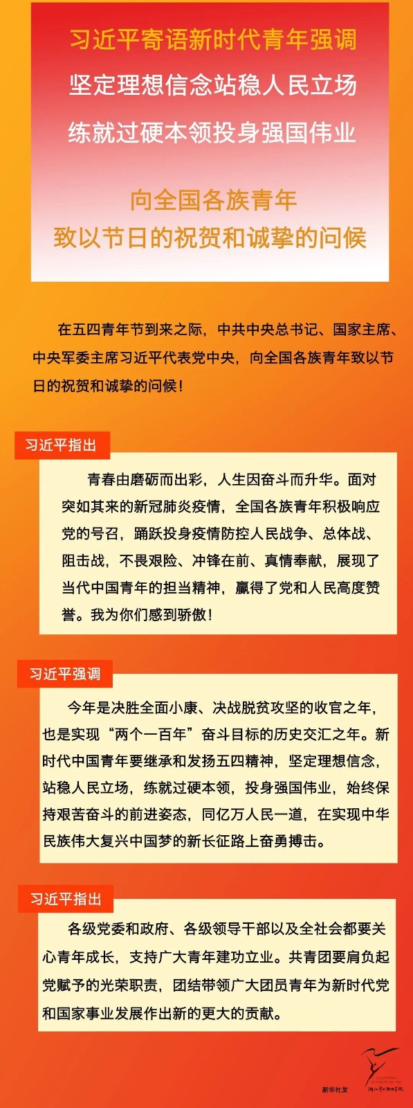 习总书记说:“青年是整个社会力量中最积极、最有生气的力量,国家的希望在青年,民族的未来在青年。”我们依然是1919年的那群少年,心中有梦,眼里有光!奋斗正当时,奔涌吧,后浪!