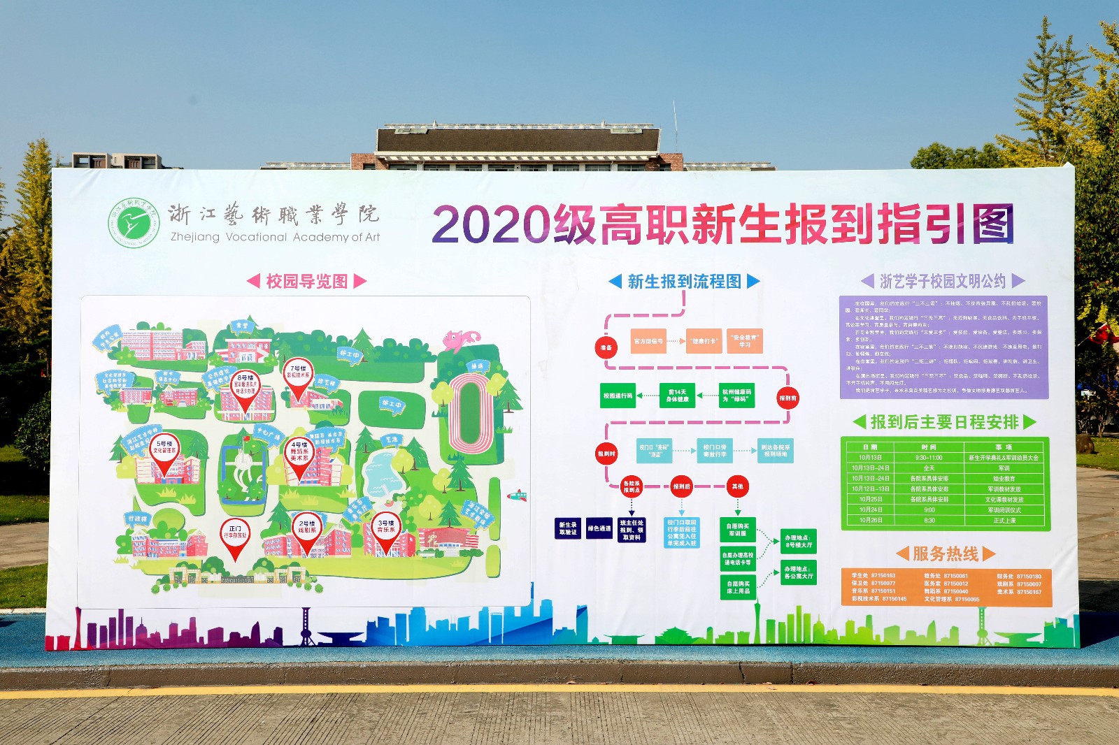 伴随着桂花馥郁的清香,节后的校园开始忙碌了起来。在“梦想启航,一路同行,热烈欢迎浙江艺术职业学院2020级新同学”的彩色背景墙的映衬下,“今日浙艺学子,明日艺术之星”“HELLO2020浙艺小萌新”“青春有你,艺路同行”,色彩鲜艳的宣传展板和条幅随处可见,这是浙艺最诚挚的欢迎,写满了对新生开学的期盼。