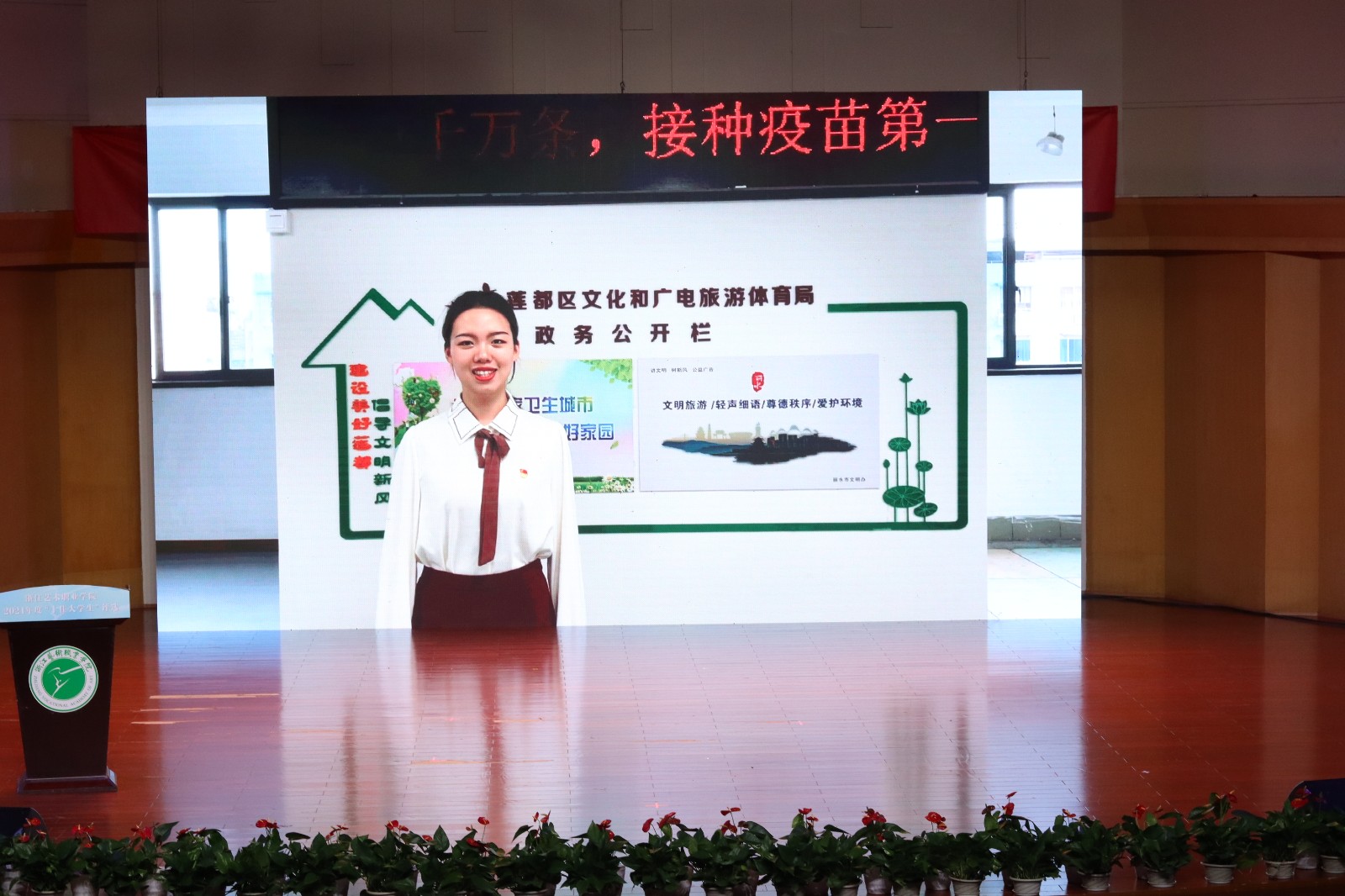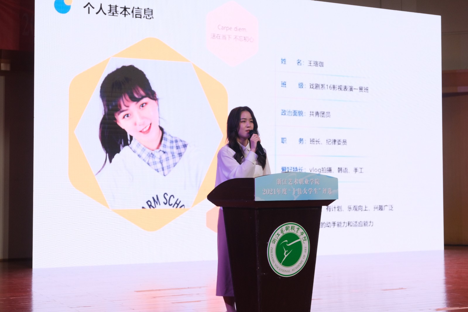 浙江艺术职业学院2021年“十佳大学生”评选活动现场展示于4月19日晚在音乐厅举行。校党委书记薛亮,党委副书记夏开堂,副院长沈军甫、支涛,党委委员、宣传部部长马向东出席,浙江省教育厅教育发展中心副主任章正春和浙江音乐学院、杭州医学院、浙江旅游职业学院、浙江机电职业技术学院、浙江商业职业技术学院等校党委学工部主要负责同志应邀出席并担任评委。