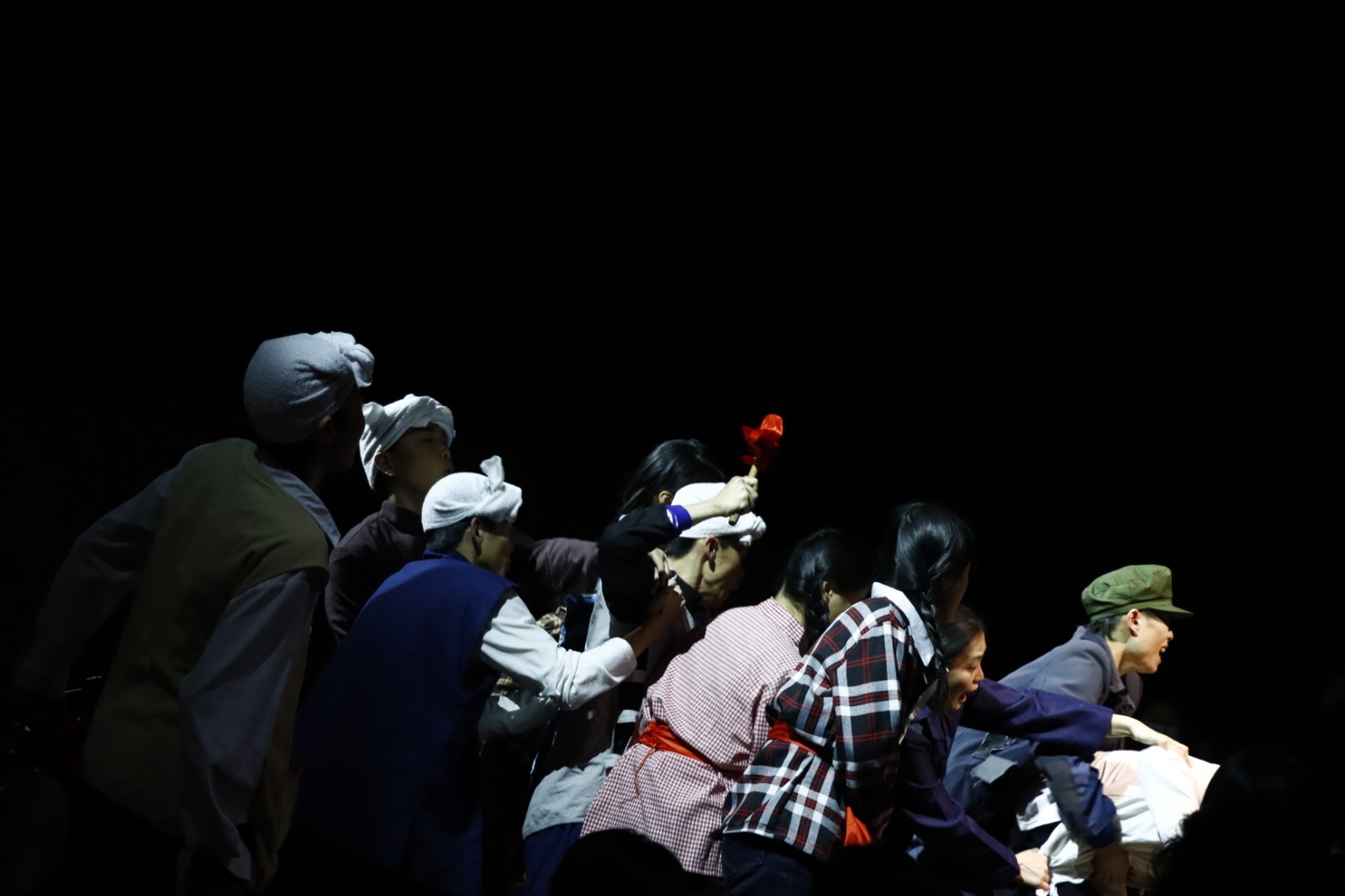 所谓沉浸式话剧,它打破了传统剧场固定的舞台和观众席位,从物理空间上打破了“第四堵墙”,随着现代戏剧不断对演员与观众交互性边界的试探和推动,“看戏”逐渐成了“体验戏剧”,这种戏剧从时间与空间上把人吸入其中,创造出类似真实世界的环境。陕北的信天游在黑匣子里唱响,故事就在这高亢嘹亮的歌声中缓缓拉开序幕,观众也仿佛置身于黄土地,感受那代人生活的起伏跌宕。这是对黄土地上艰辛生活的写照,也展现着苦难碾压下倔强生长的爱情和理想。