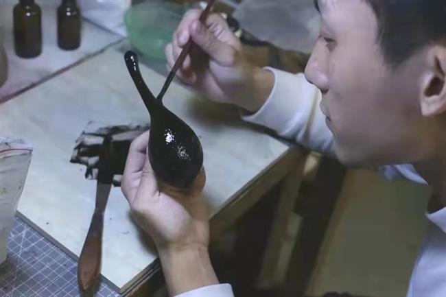 青瓷烧造小组的每一位同学在制作青瓷时脚踏实地,耐心仔细,仿照古代不同用处的瓷具烧制出茶盏、香炉、茶壶、宋砚、耳饰等多个精美的作品。水印木刻模块中,《示儿》《市集》《南宋赏玩指南》《园林四景》《岑绛》《千里江山图》《囍》等作品的严谨制作,可以看出同学们对南宋传统习俗做了深入的了解。《三链章 二链章》《十二星宫图》等石刻作品采用石雕技艺中链雕、镂空等手法,体现出同学们高超的手法以及扎实的石刻功底。
