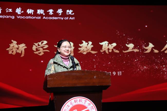 2月19日,浙江艺术职业学院新学期全体教职工大会在浙江实验艺术剧场举行。校党委领导班子成员薛亮、黄杭娟、夏开堂、章轲、徐芳、沈军甫、支涛、马向东、刘杨出席,全体教职员工参加。院长、党委副书记黄杭娟主持大会。
