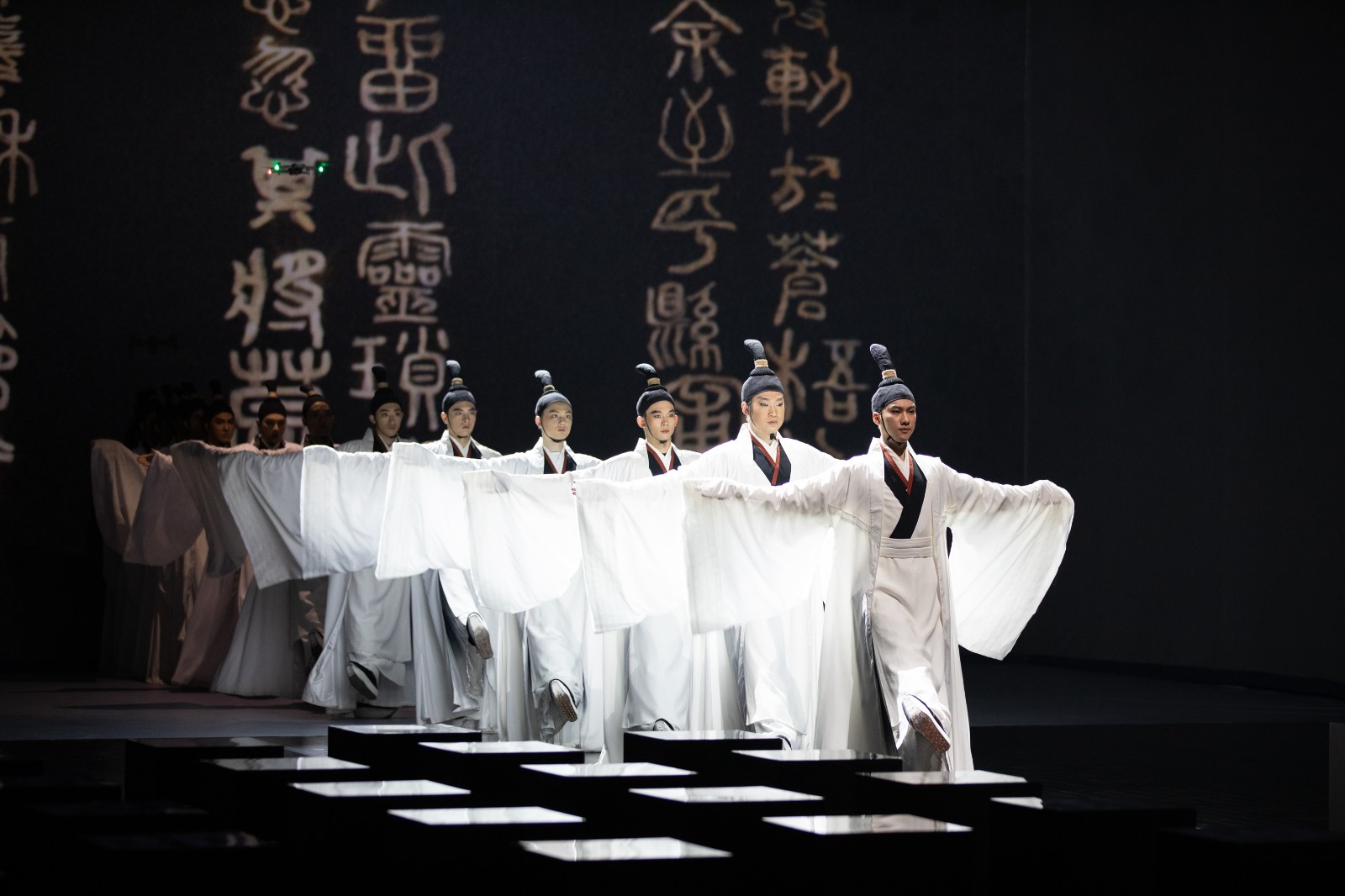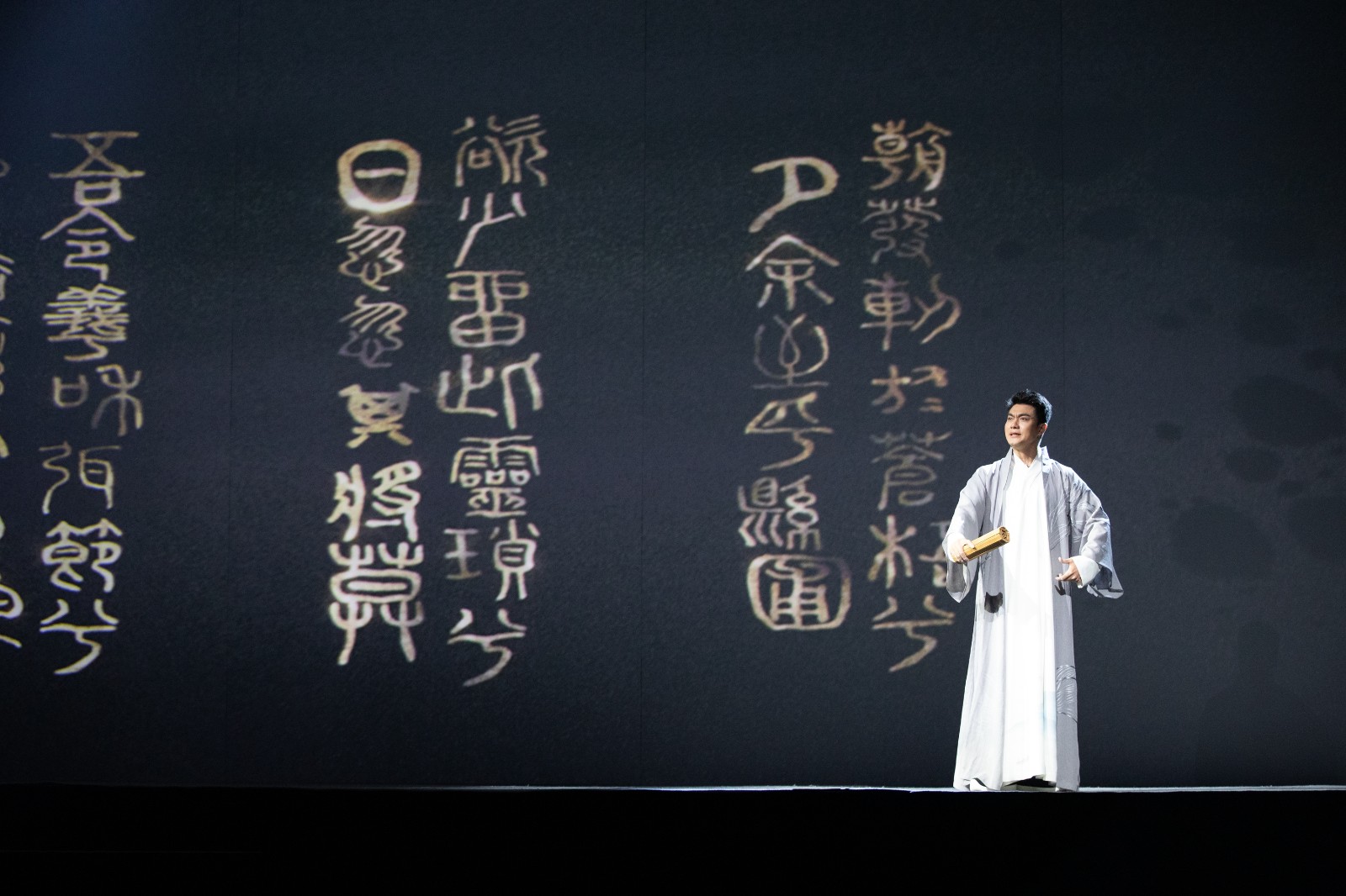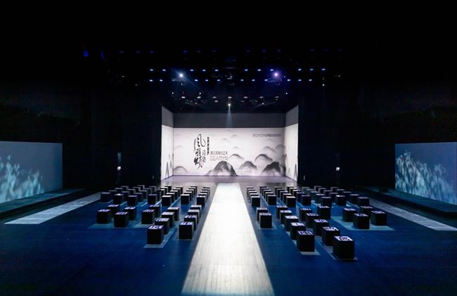 诗词吟唱、经典折子戏、朗诵、舞蹈以及民乐演奏等,《诗路风雅颂》新声度曲。特别设计的“诗魂”一角贯穿始终,恰是无数诗人美好品格的归一。舞台设计方面,长轴画卷、亭廊榭、山水影像等不同宋代元素巧妙组合,有机串联起东西南北四个表演区。观众席居中,座椅由宋体活字印刷模型转化而来,满是诗词元素,与舞台深度融合,与演员同在一个意境。中国古代四大发明的三项出现在宋朝,其中与人类文化传承最紧密的当属活字印刷。宋体是流传至今的文化符号,是中华文明最好的传承和演化之一。歌、舞、咏、乐、书、诗、词与巧思匠心的舞美设计跨界融合,今人演绎古典美,尽显精致典雅隽永,独具韵味。