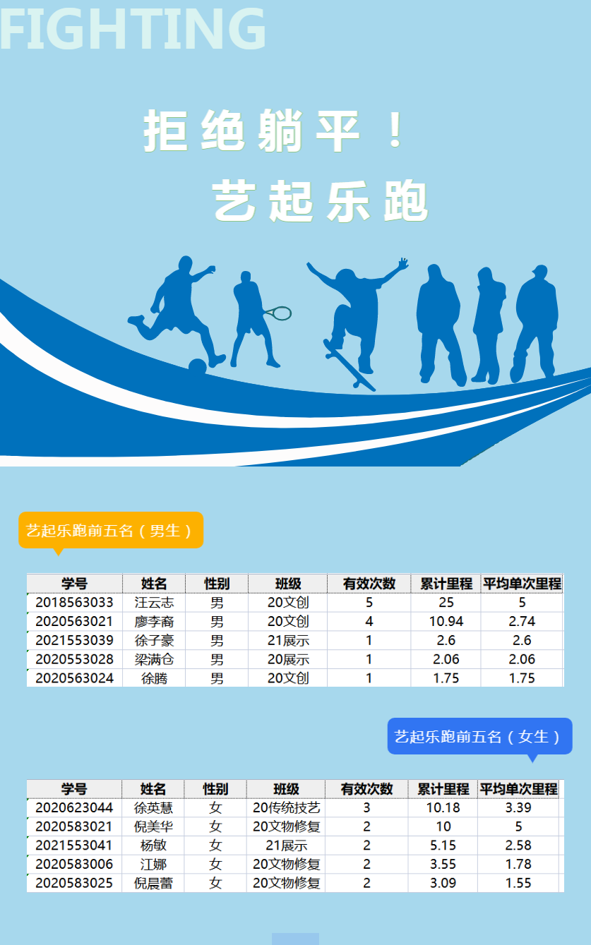 前期抽测筹备工作整体严密有序,紧凑高效,各相关学院积极配合,广泛开展思想动员。手工艺学院开展“拒绝躺平!艺起乐跑”活动,演艺与教育学院开展“青春不打烊,抗疫有力量”系列活动,通过跑步里程排名、寝室集体跳操等多种形式,鼓励学生加强体育锻炼,营造了积极的运动氛围,为抽测工作的顺利开展奠定了良好的基础。