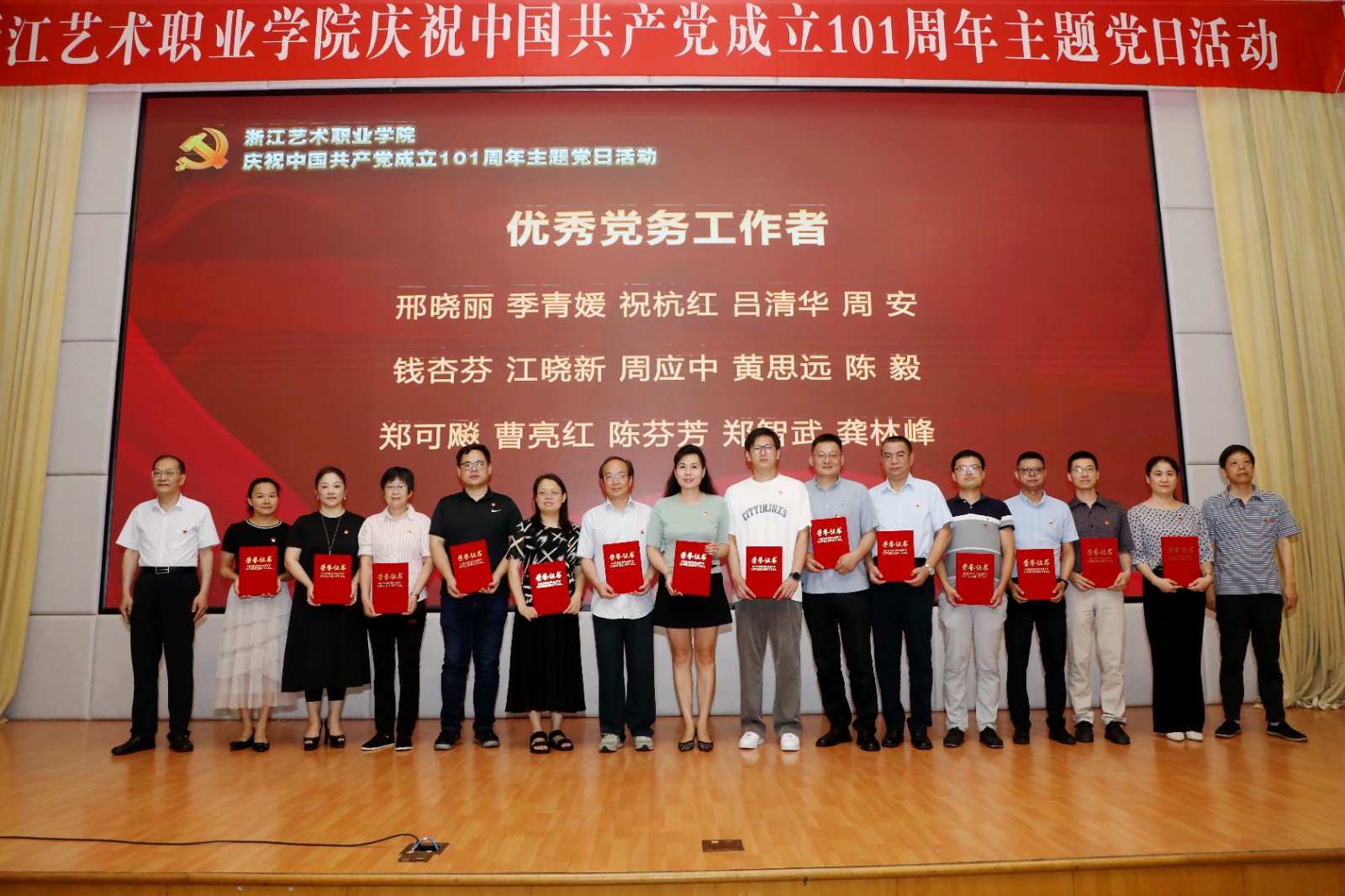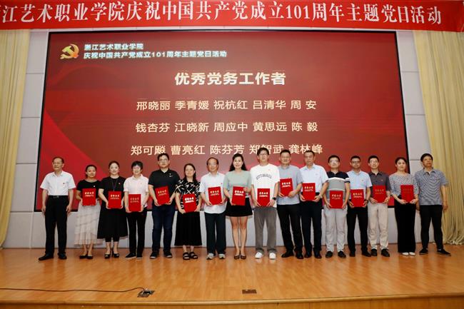 为庆祝中国共产党成立101周年,回顾党的光辉历程,讴歌党的丰功伟绩,赓续红色血脉,浙江艺术职业学院在学校图信报告厅隆重举行庆祝中国共产党成立101周年主题党日活动。校党委班子成员,各党总支、直属党支部书记、副书记,全体中层干部、主管岗位人员,基层党支部书记、组织员和师生党员代表、学校“两优一先”受表彰对象、2022年发展的新党员代表参加活动。校党委书记薛亮作省十五次党代会精神宣讲,院长、党委副书记黄杭娟宣读表彰名单,校党委副书记夏开堂主持活动。