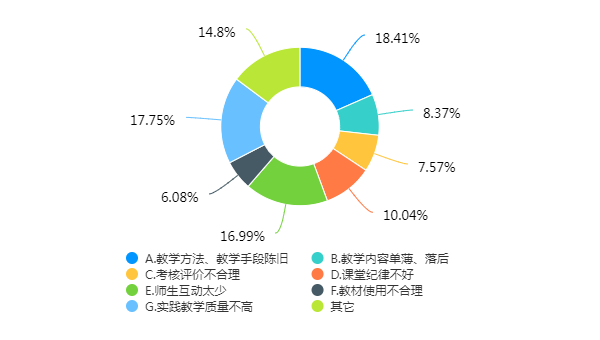 课堂教学及实践教学中存在的主要问题。学生认为存在教学方法、教学手段陈旧问题的占18.41%,认为实践教学质量不高占17.75%,认为师生互动太少占16.99%,可见强化教法改革,推进课堂教学创新改革的紧迫性仍然应当引起重视。