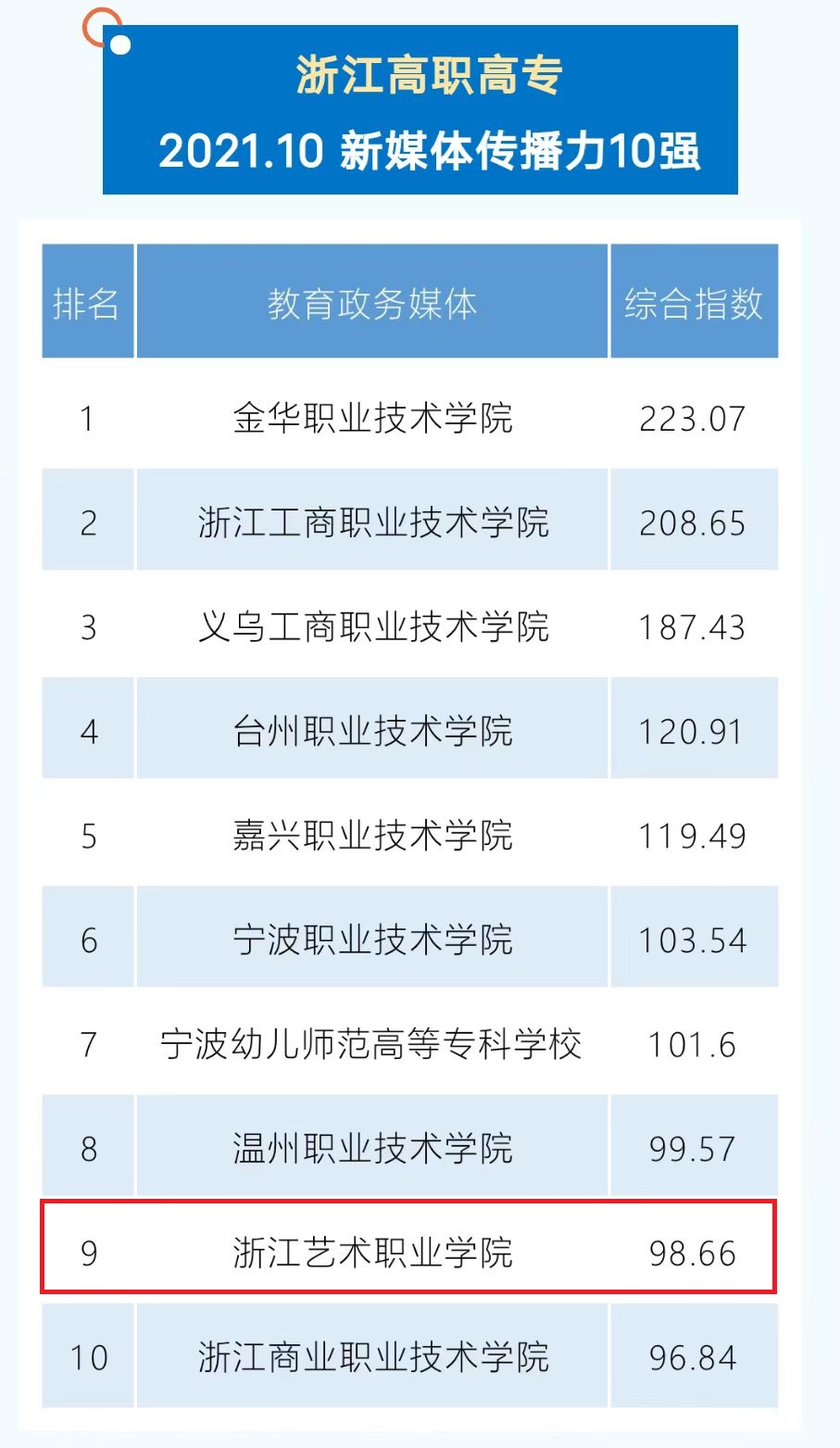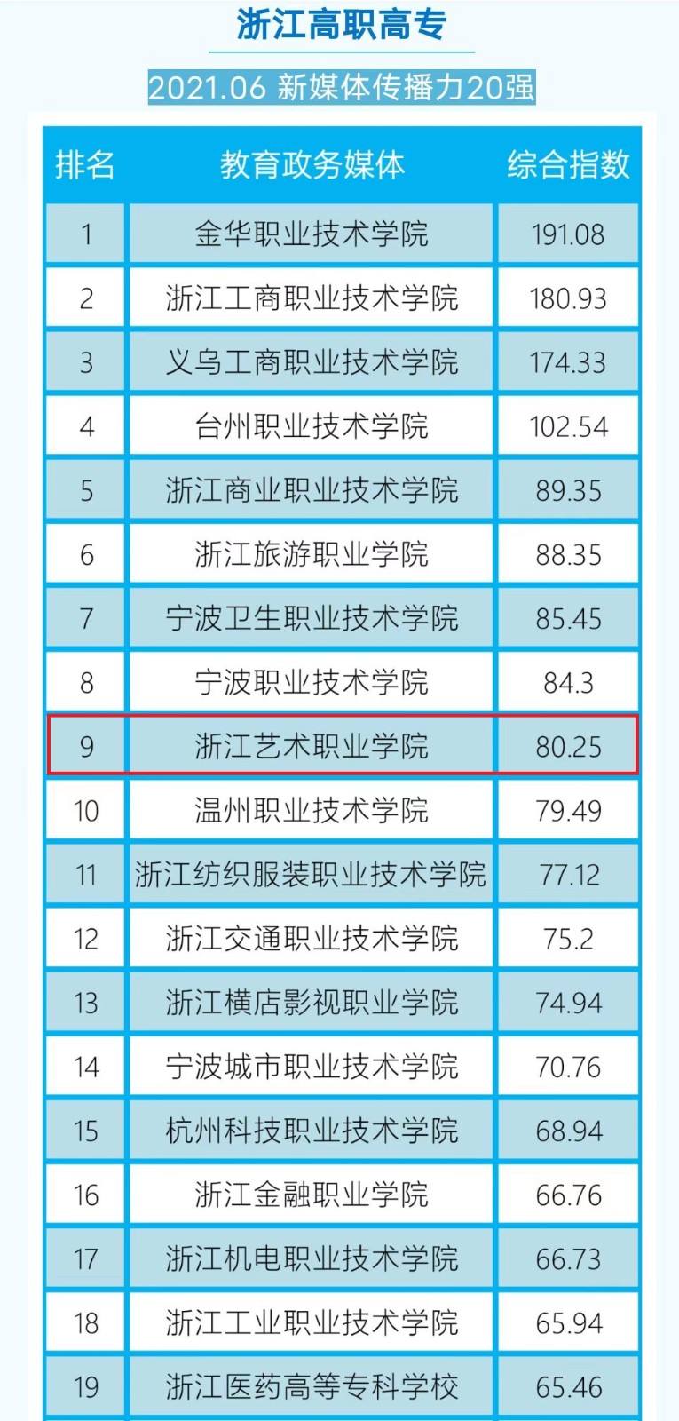 在2021年浙江教育政务新媒体传播力月排行榜中,浙艺多次进入全省高职院校前十强。