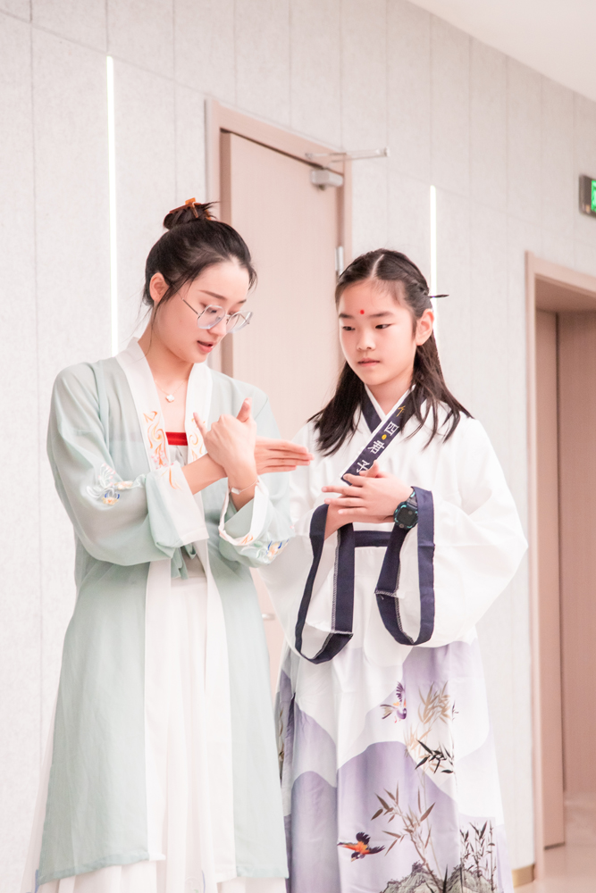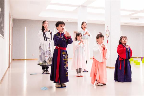 走进浙艺学的宋韵亲子游园会的现场,大厅中庭布置了经典宋画《千里江山图》《女孝经图》,书法纱幔、植物标本灯笼,古韵音乐伴随着游园活动流淌开来。“开笔礼”、点红仪式、“作揖礼”带领小朋友们开启宋韵世界。家长们表示,这场活动主题好、寓意深,让少年儿童从内心深处认同和喜爱我们的传统文化。
