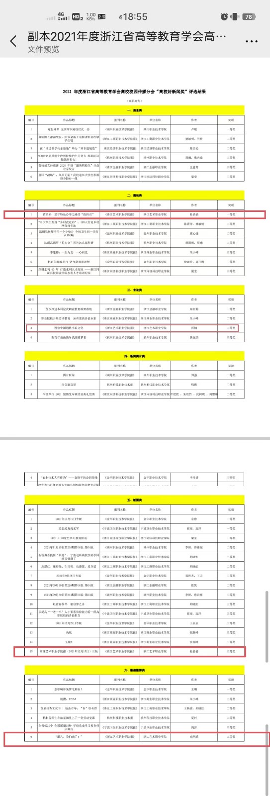 近日,2021年度浙江省高校好新闻作品评选结果出炉,我校获多个奖项。《黄杭娟:坚守特色办学之路的“指挥员”》(作者:杜俏俏)获通讯类一等奖,《漫谈中国通俗小说文化》(作者:厉楠)获言论类三等奖,《浙江艺术职业学院报》2021年12月15日三版(编辑:杜俏俏)获版面类三等奖,《“浙艺,我们来了!”》(作者:俞珂瑶)获微信微博类三等奖。