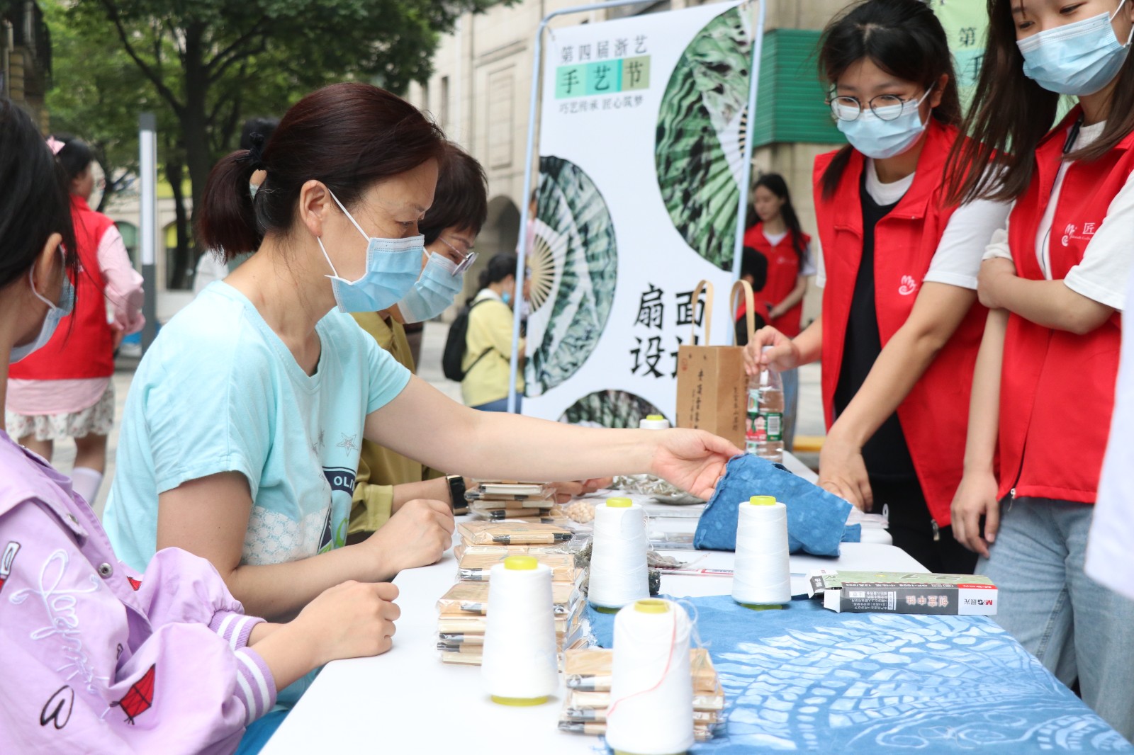 ▲浙艺师生走进东信社区,带领居民体验端午香包、创意扎染、创意扇面、剪纸等非遗技艺