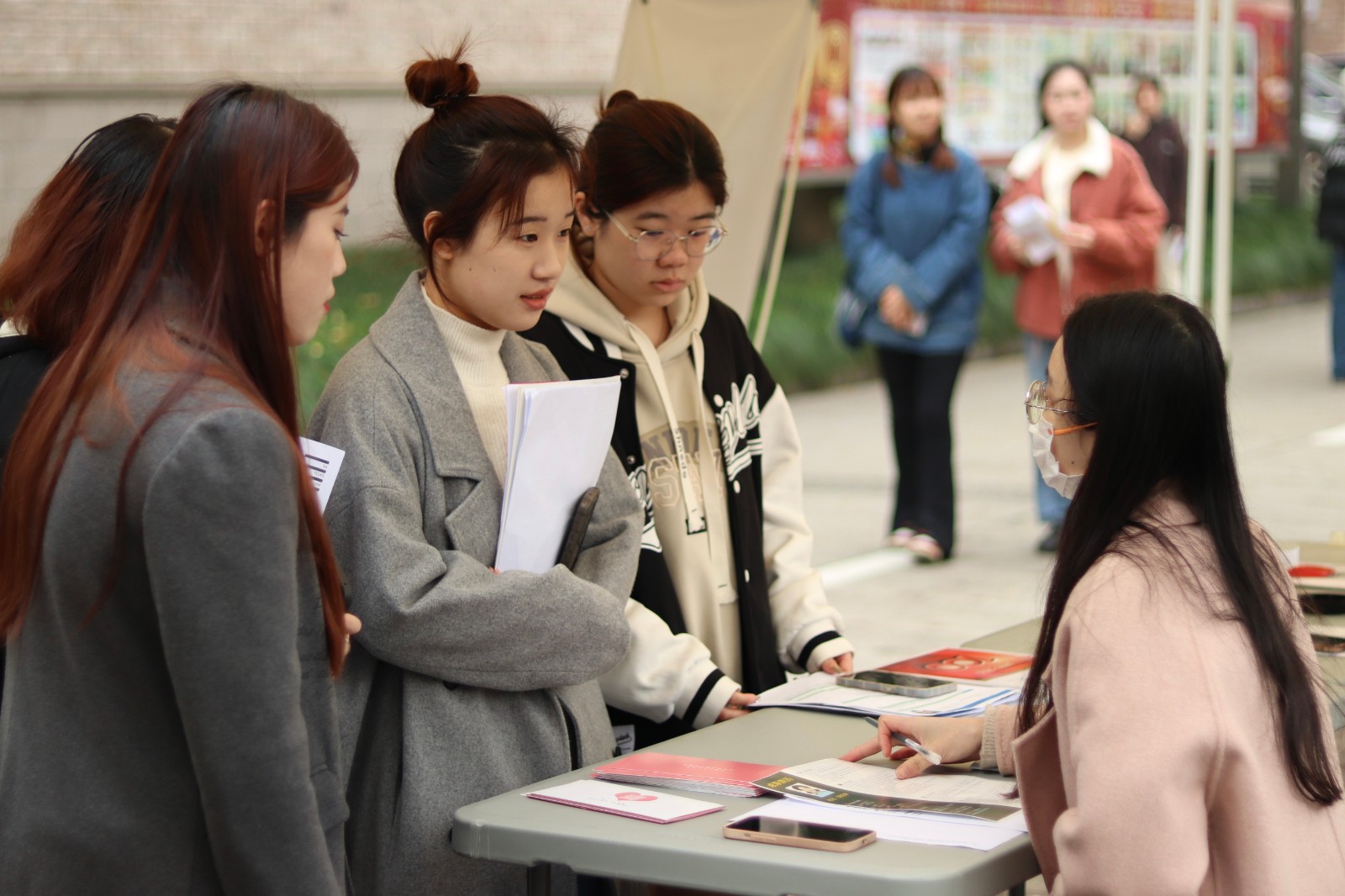 招聘会现场,2023届毕业生们着装整洁,手持简历,认真浏览招聘企业信息,寻找自己感兴趣的岗位,积极主动地与企业招聘人员沟通、交流,介绍自己的专业优势和岗位期待。