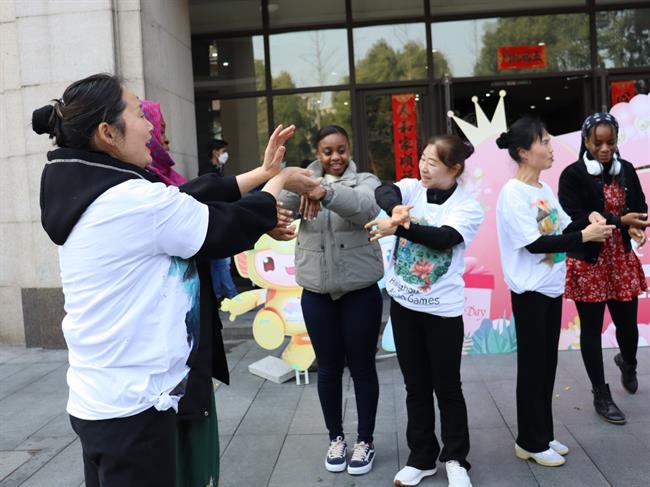 广场舞老师手把手教学,耐心示范,教学方式灵活,交流气氛热烈,外国友人们现学现练,受益匪浅,大家一起“舞”动亚运,展现青春风采。
