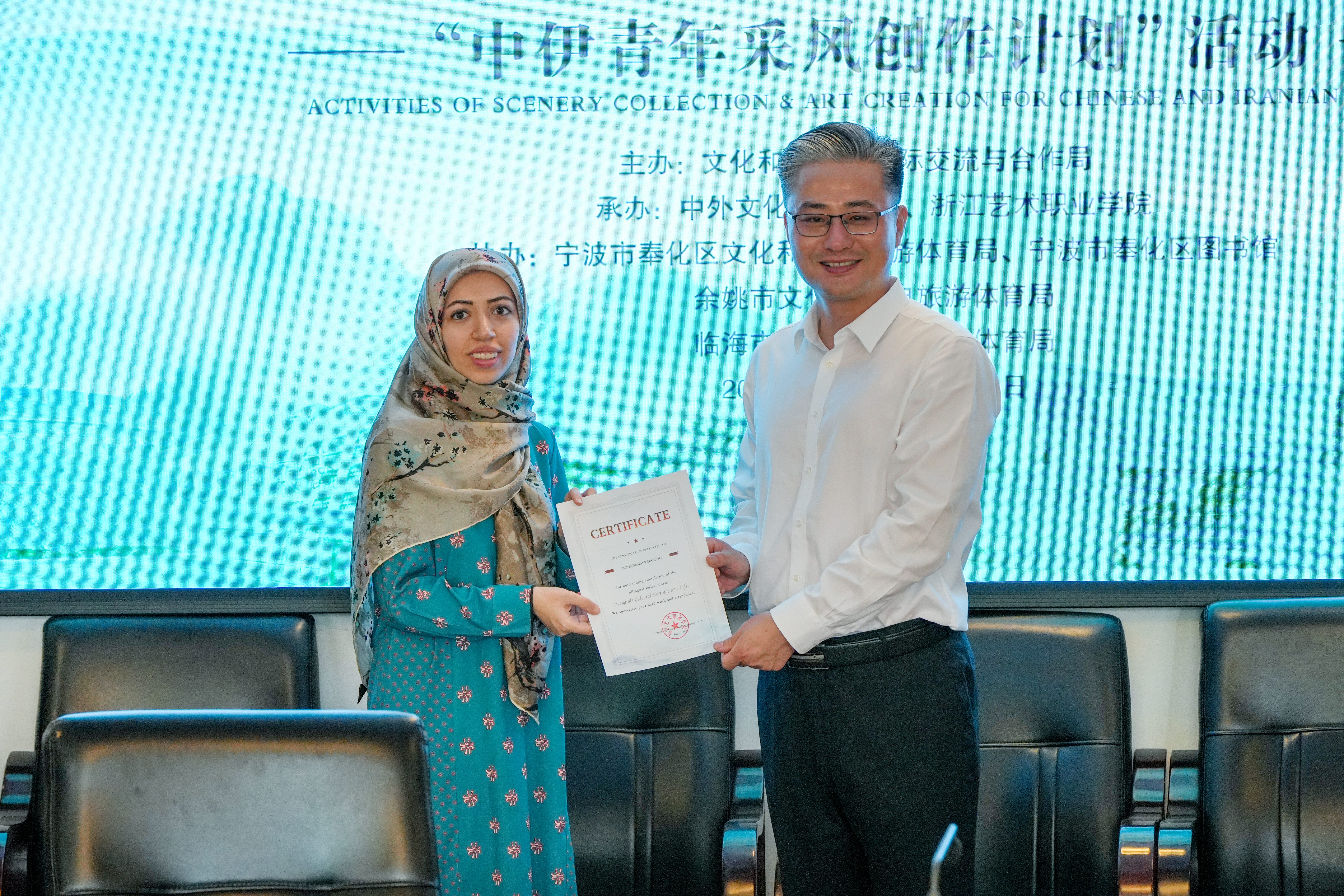 浙江艺术职业学院作为承办方,依托全国非遗传承人研究研习基地、省级非遗传承与研究基地、教育部“双师型”教师培养培训基地,积极筹备、广泛联络、精心策划非遗课程和活动方案,伊朗青年学者与浙江艺术职业学院师生一道,与地方文旅广电局一起,圆满完成了曲艺、非遗技艺的学习和课程输出。