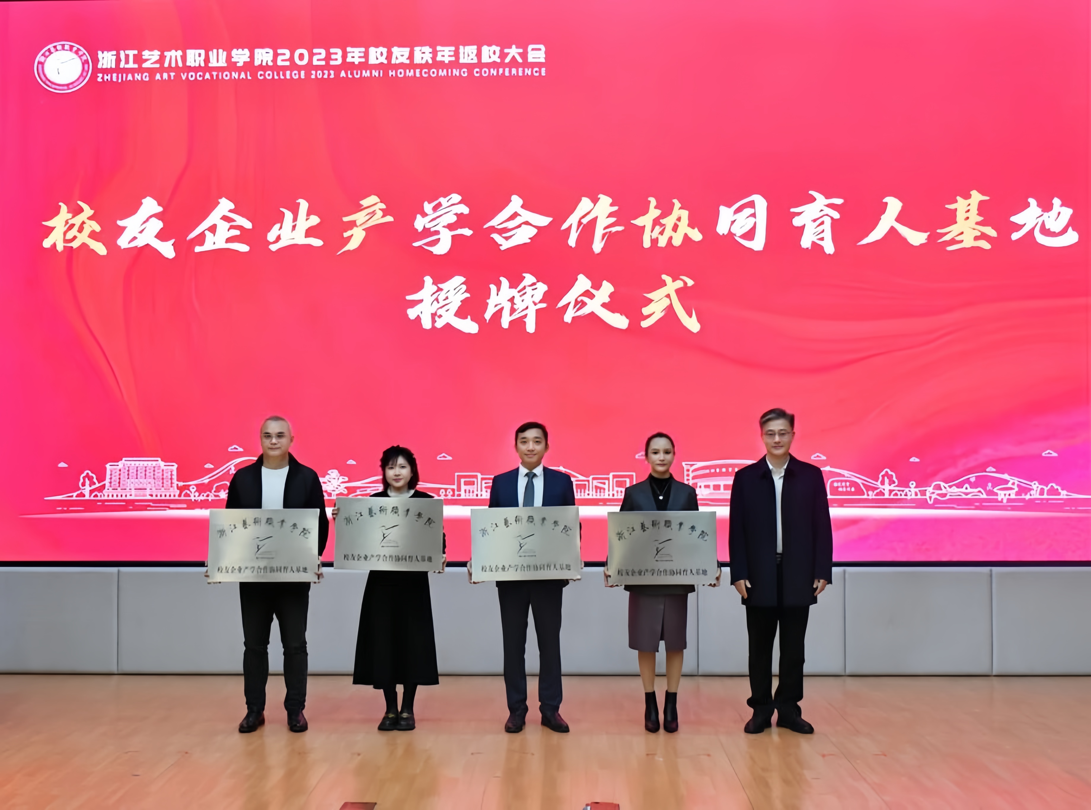 校友企业代表柯程方为母校送上祝福,对学校开拓校友企业产学合作专项通道表示感谢。华汇音响顾问公司、阿达云计算、浙江瑞锦文化演艺有限公司、浙江演艺集团艺术培训有限公司四家校友企业签约成为学校首批“校友企业产学合作协同育人基地”。薛亮为校友企业代表陶建新、韩荔、柯程方、张毅萍授牌。