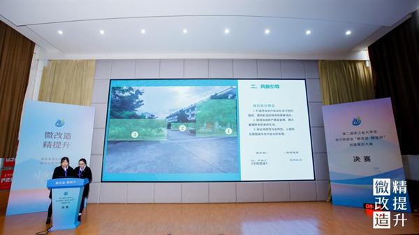 决赛现场,12组入围作品的选手代表依次上台,结合PPT和视频讲解,紧扣项目需求和设计的现实意义,对设计的整体方案、创意思路、专业知识运用等多方面进行陈述和答辩,聚焦“微改造 精提升”成果,展开激烈对决。