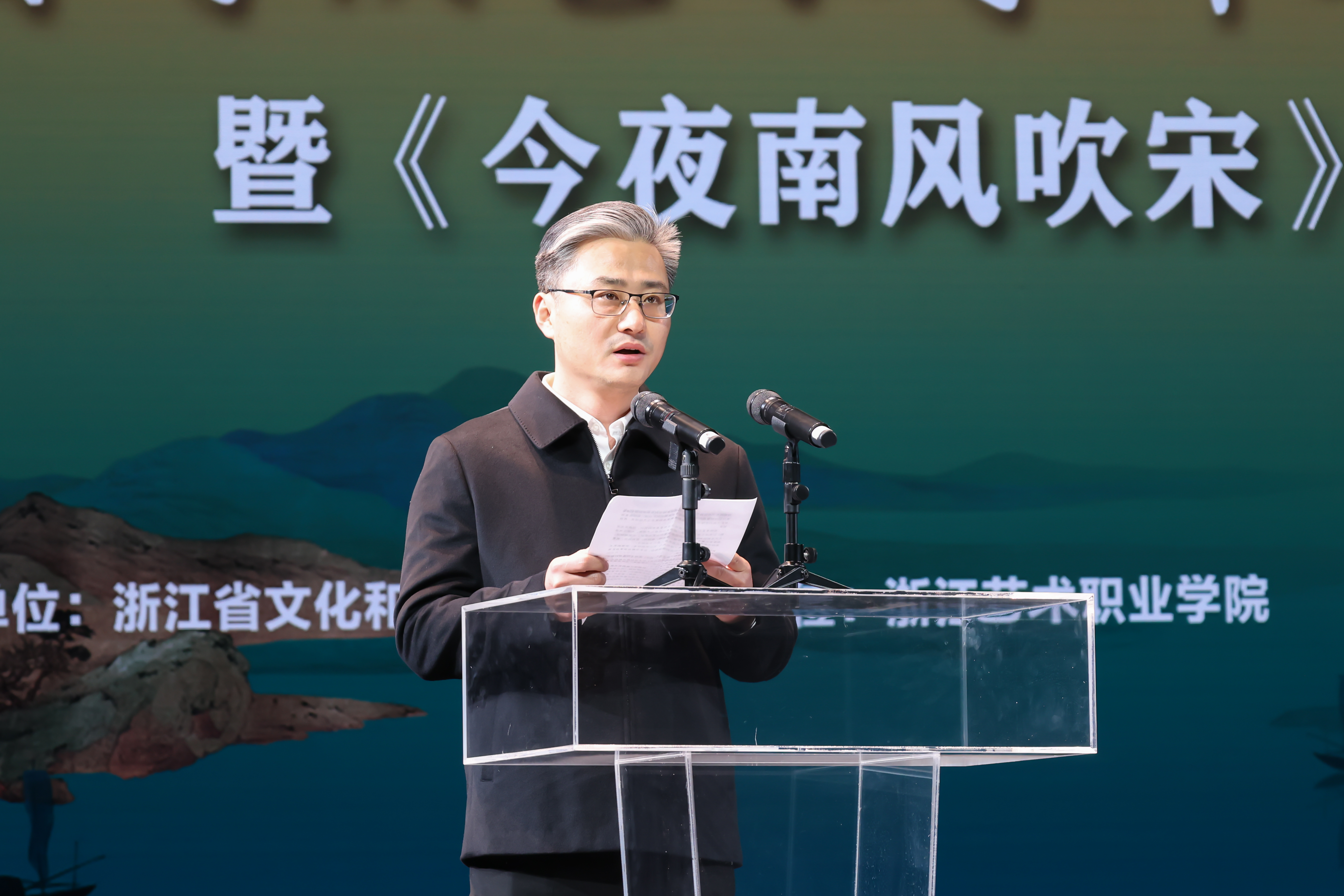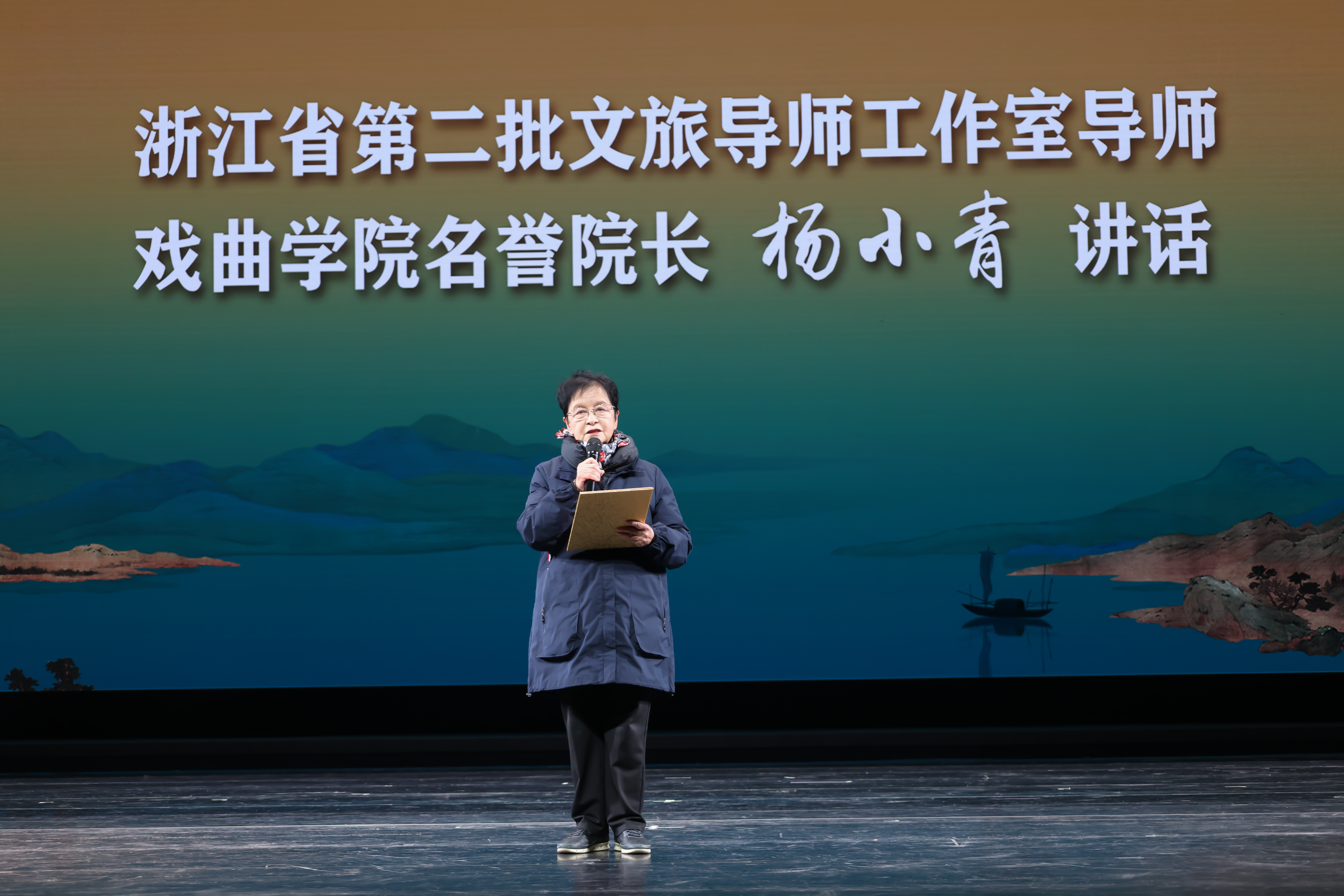 12月18日晚,浙江省杨小青导演艺术导师工作室挂牌仪式暨《今夜南风吹宋》专场演出在浙江实验艺术剧场举行。浙江省文联书记处书记赵晓刚,浙江省委宣传部原副部长吴天行,浙江艺术职业学院党委书记薛亮、院长施俊天、原院长黄杭娟,浙江省文化和旅游厅人事处处长胡雁,浙江小百花越剧院院长王滨梅,浙江艺术职业学院党委副书记夏开堂,副院长沈军甫、支涛,党委委员、宣传部部长、统战部部长马向东,党委委员、组织部部长、人才办主任刘杨,浙江省戏剧家协会副主席、秘书长谢丽泓,浙江省评论家协会副主席、秘书长沈勇以及各大戏曲院团负责人、行业专家出席。活动由施俊天主持。