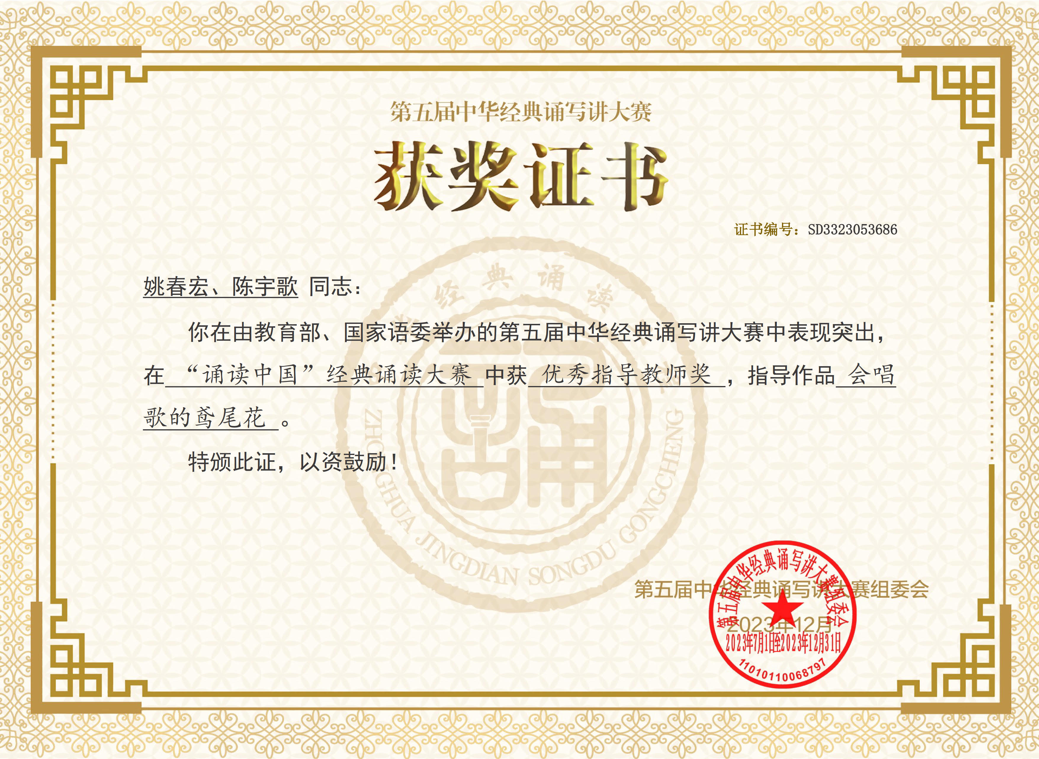 从组赛、校赛,到省赛、国赛,一共历经了6个月的时间,在这段时间里,我深深感受到了中国传统文化的魅力和内涵。通过朗读这些经典作品,我更深入地理解了它们所传递的智慧和价值观,也明晰了自己在传承和推广中华文化中的责任和使命。我要特别感谢姚春宏老师对我的指导和教诲,让我在有声语言学习的道路上不断进步。在比赛的准备过程中,姚老师和我们一起,付出了大量的时间和精力,为了能够完美呈现作品的每一个细节,我们反复推敲每一个字句的发音和语调,不断调整朗读的节奏和情感表达。我们相信,只有通过这种精雕细琢的方式,才能真正传达出作品所蕴含的深刻内涵和情感。