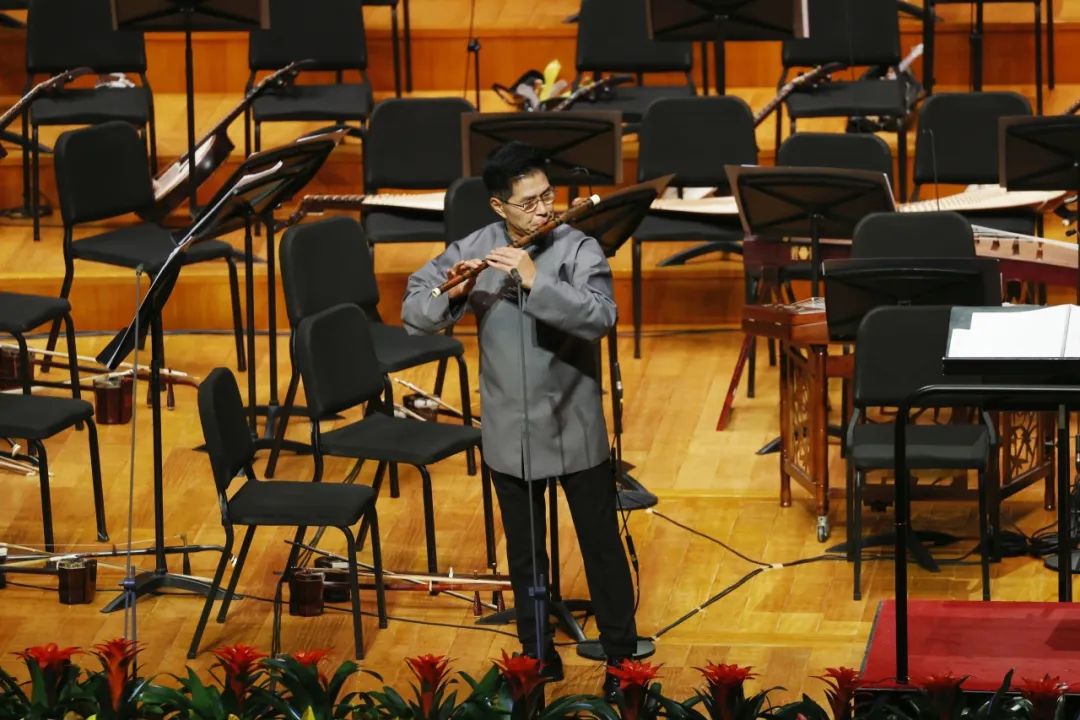 吴樟华教授带来的排笛与乐队《腾飞》由作曲家朱晓谷创作于2018年,乐曲以活泼明快,热情洋溢的气氛渲染,以乐而贺,松庭流芳,恰如作品中所呈现的钱江潮水奔腾不息。