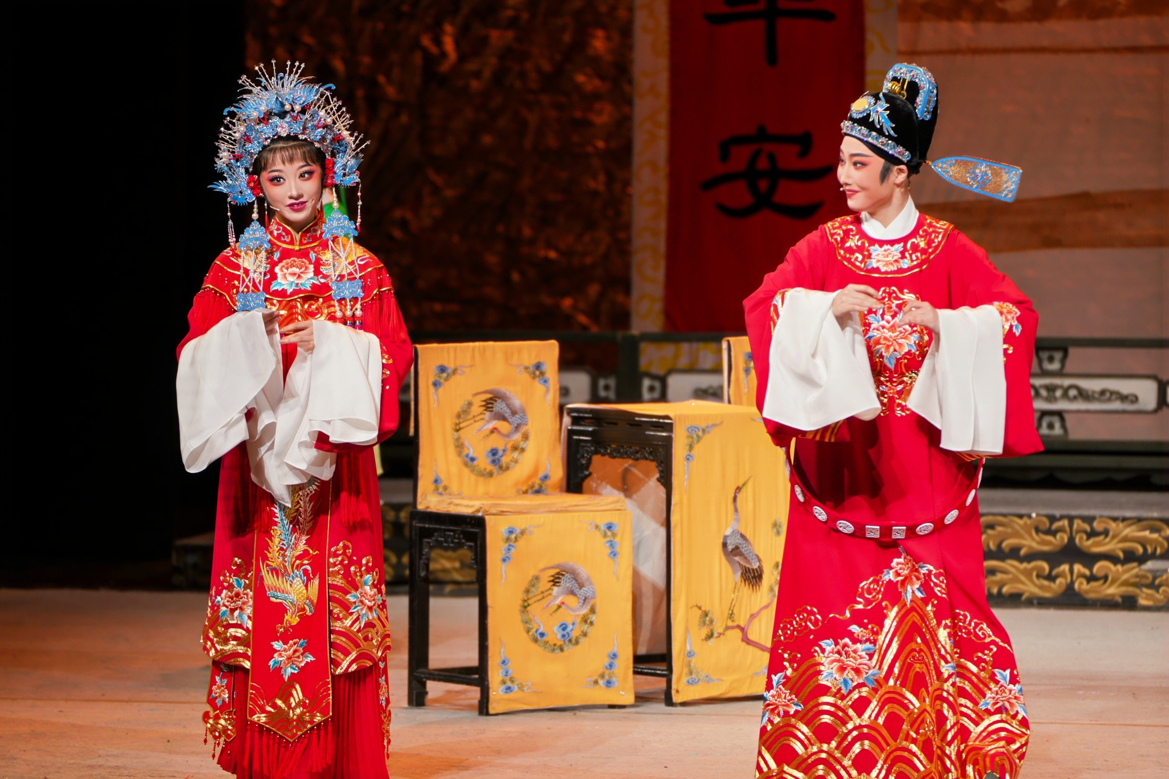 随着大幕缓缓拉开,伴唱响起:“牡丹竞放笑春风,喜满华堂寿烛红。”同学们以清婉丽音、细腻表演,将这部经典剧目重新演绎得淋漓尽致。舞台上,她们或喜或悲,或怒或嗔,每一个动作、每一个眼神都充满了戏剧张力,让观众仿佛穿越时空,回到了那个充满爱恨情仇的时代。