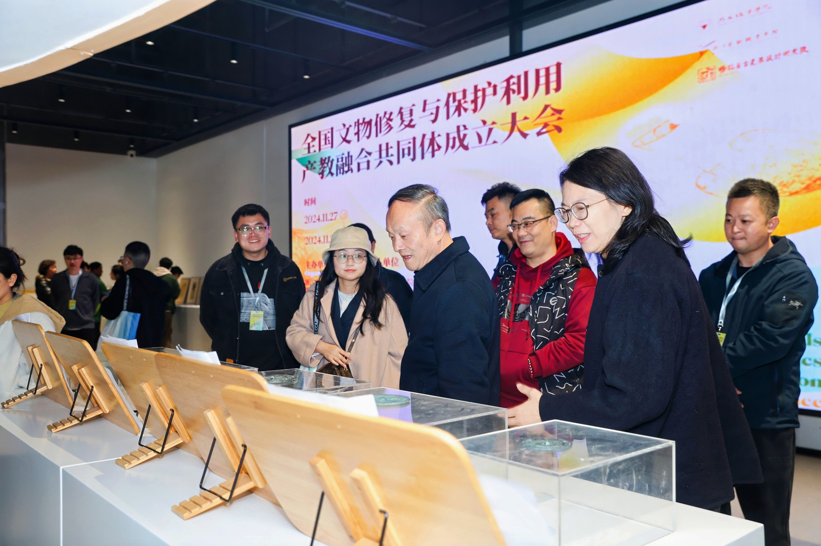 在大会的间歇,与会嘉宾参观了位于新大楼美术馆的“艺起传承——手工艺学院文物修复与保护专业教学成果展”。展览分为序厅、教学文献手稿区、书画古籍修复展示区、古陶瓷修复展示区、新设古建筑与壁画方向展示区以及教学影像与结语区六大板块,全面展示了我校在文物修复与保护教育方面的深厚底蕴和丰硕成果。
