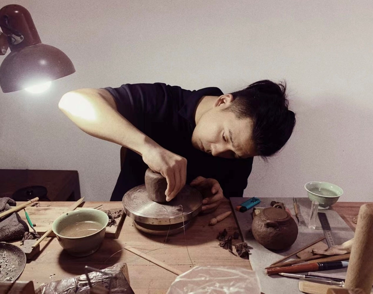 创作理念:这把宝瓶的创作最开始是因为一款新的泥料的烧成。出来的效果一下就让我联想到了以前外婆家门口的一棵古树。确定好主题后,在细节上,添加了很多长的线条。我认为长线条是有流动的,有力量的,就好像虽为枯木也可逢春。在技法上运用了手捏,拍泥片还有粉引。手捏的技法会让整个壶型状态更加质朴和放松。传统的紫砂壶拍泥片则能让其在实用性功能性上有好的把控。