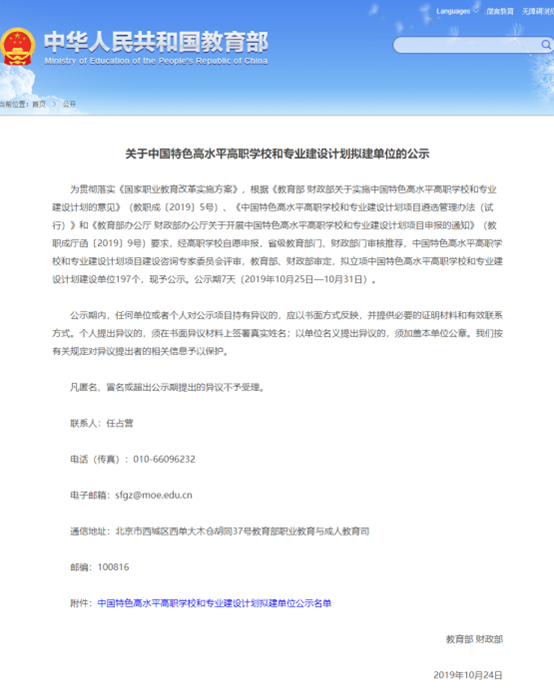 入选中国特色高水平高职学校和专业建设计划拟建单位