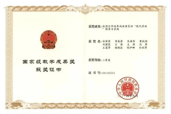 2014年,《校团合作培养戏曲演员的“现代学徒制”探索与实践》获国家级教学成果二等奖。
