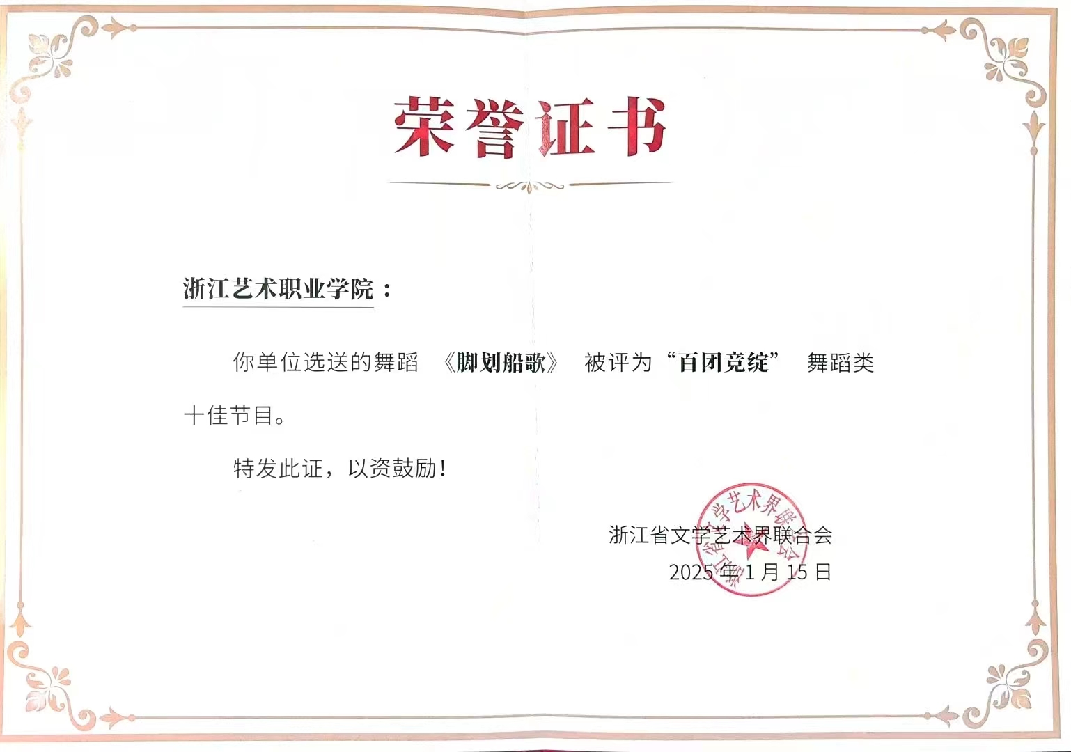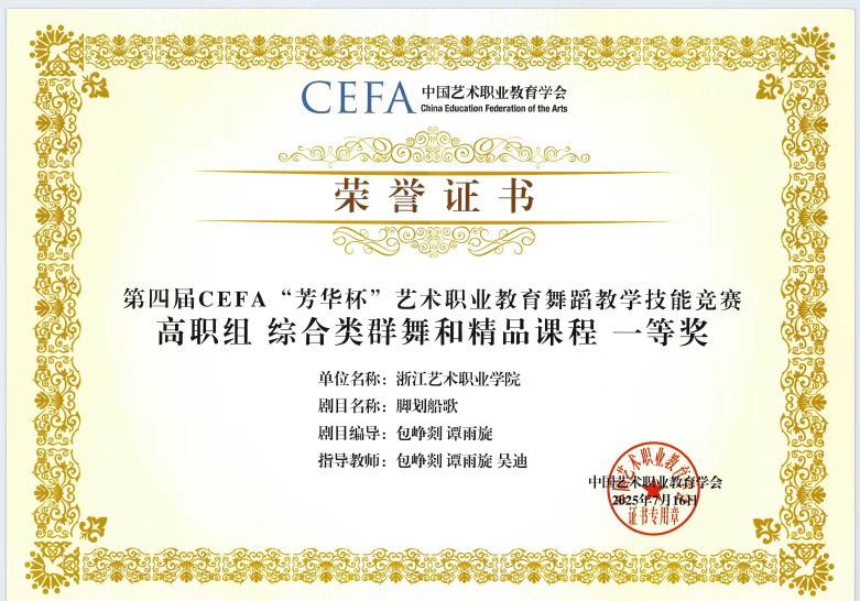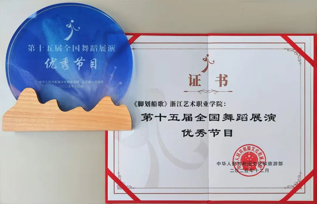 近日,由文化和旅游部、江苏省人民政府联合主办的第十五届全国舞蹈展演圆满落幕。浙江艺术职业学院舞蹈学院的作品《脚划船歌》亮相展演现场,荣获“优秀节目”奖,在全国舞台上展现出浙艺舞蹈的独特风采。本届展演汇集了全国10部舞剧、舞蹈诗及51个舞蹈节目,代表了近年来我国舞蹈创作的最高水平。